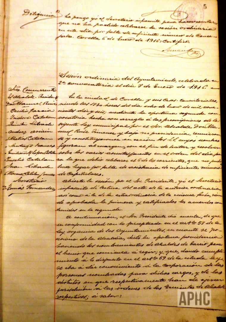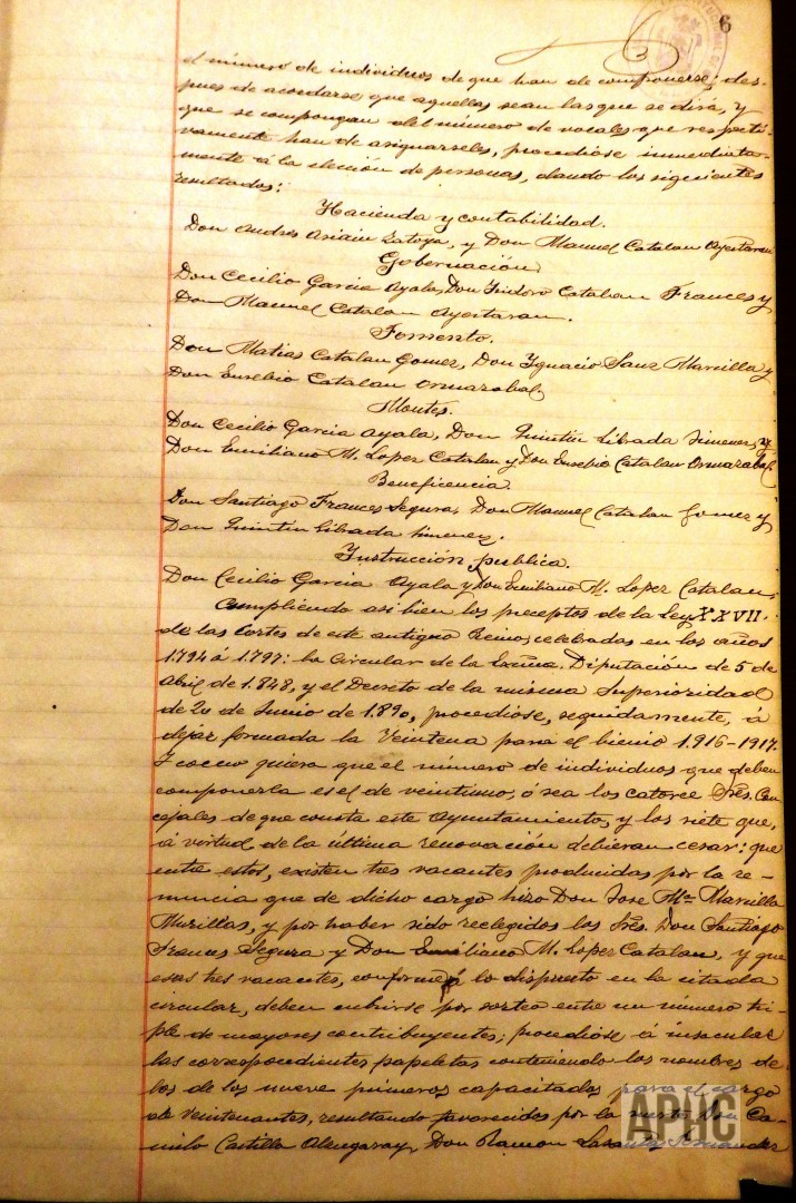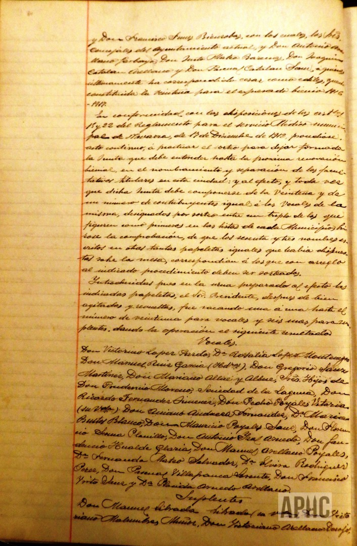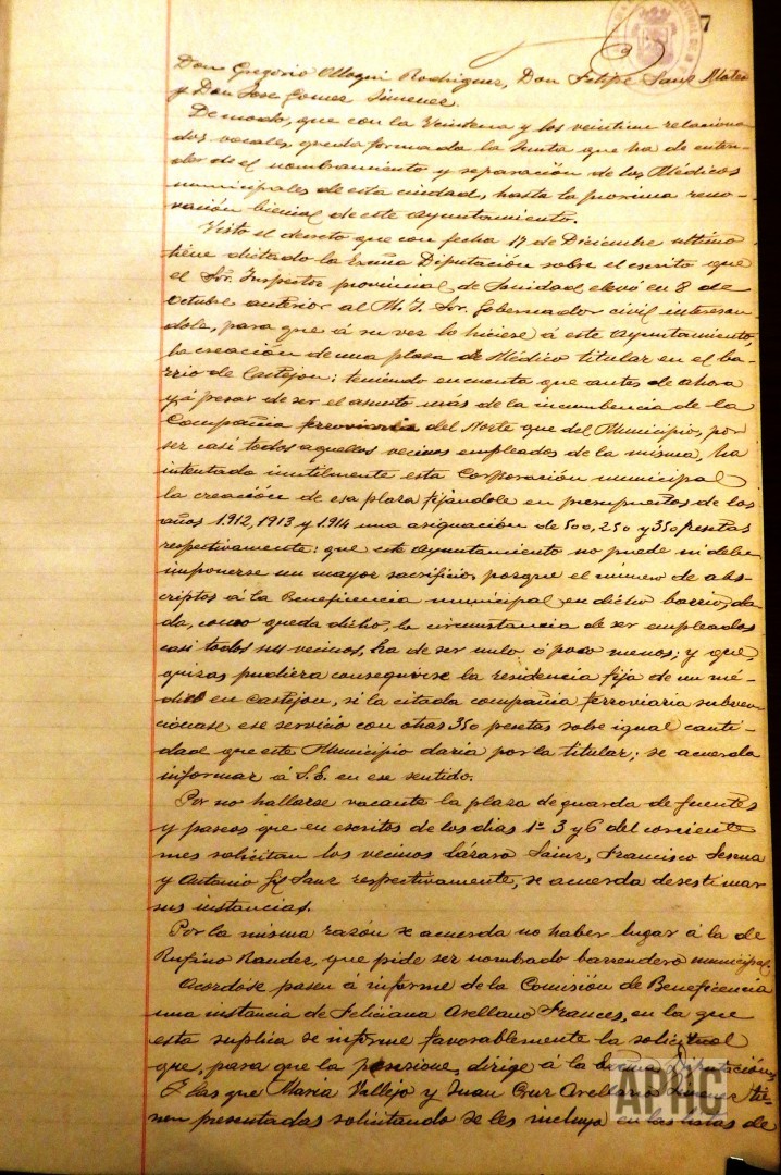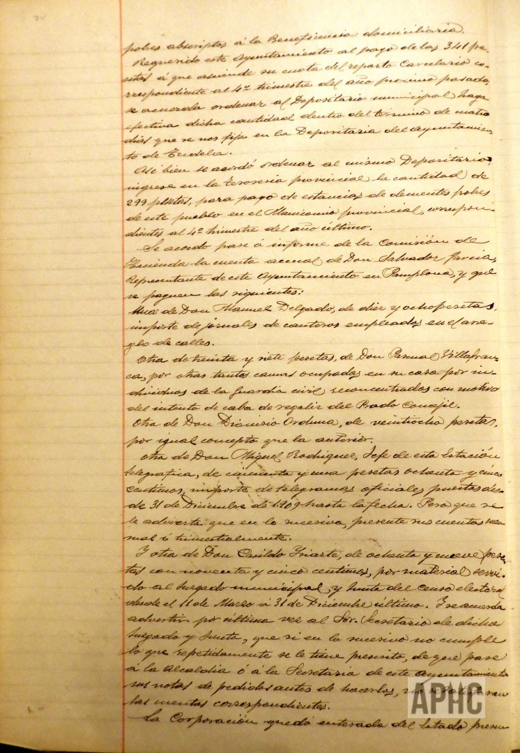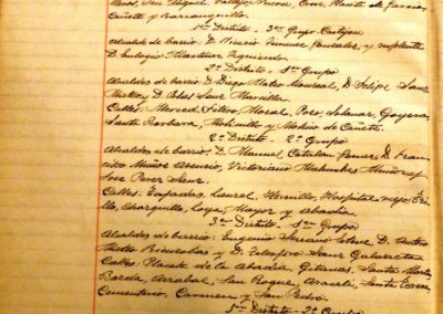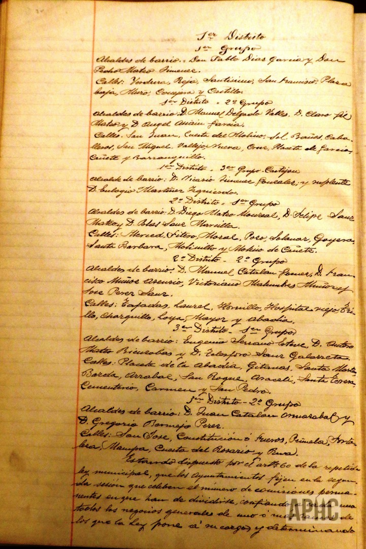 Primer Distrito, Grupo 1º: Pablo Díez García y Pedro Mateo Jiménez, y comprende las calles Verdura, Reja, Santísimo, San Francisco, Plaza Baja, Muro, Conejera y Castillo. Grupo 2º: Manuel Delgado Vallés, Claro Gil Mateo y Ángel Asiáin García y comprende las calles San Juan, Cuesta del Molino, Sol, Baños, Caballeros, San Miguel, Vallejo, Nueva, Cruz, Placeta de García, Cañete y Barranquillo. Grupo 3º, Castejón: Alcalde, Nicasio Jiménez González y suplente Eulogio Martínez Izquierdo.