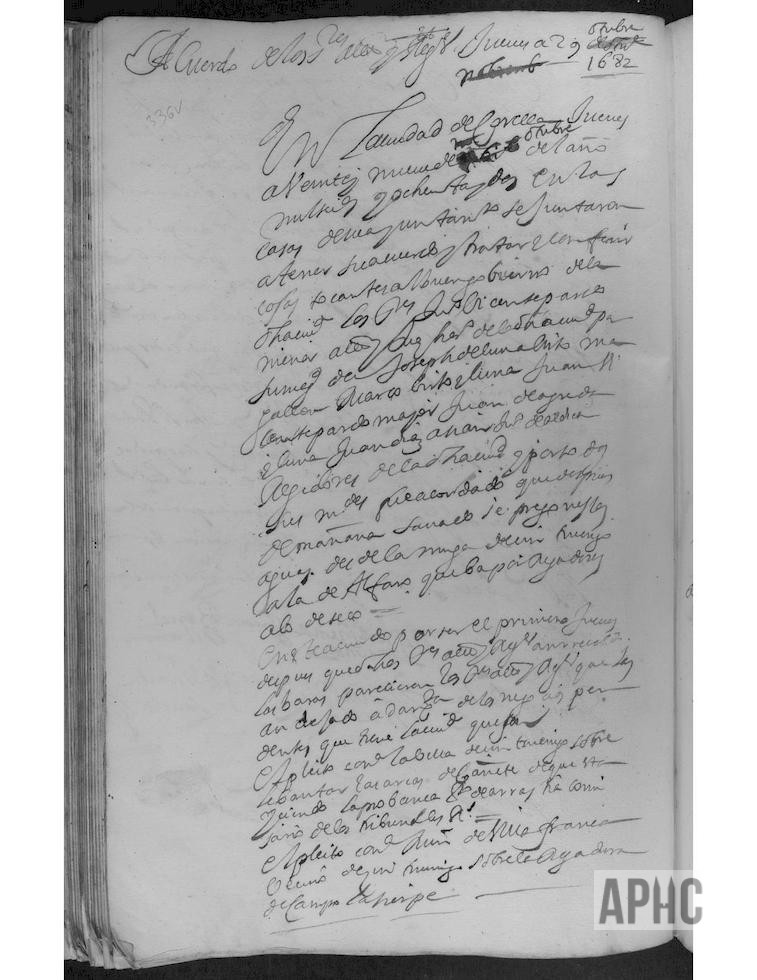 En la ciudad de Corella a 29 de octubre de 1682, en las casas de su Ayuntamiento, se juntaron a tener su acuerdo, y tratar y conferir cosas tocantes al buen gobierno de la dicha Ciudad, los señores Juan Vicente Pardo menor, Alcalde y Juez Ordinario de esta Ciudad, por su Majestad; Joseph de Luna Virto Magallón, Marco Virto y Luna, Juan Vicente Pardo mayor, Juan de Ágreda y Luna, Juan Díaz Asiain y Diego Andrés de Arcaya, Regidores …/…, se detallan los pleitos pendientes como son contra la villa de Cintruénigo, por levantar las arcas de Cañete; también el pleito criminal contra Martín de Villafranca, vecino de Cintruénigo, sobre haber levantado el agua perteneciente a Corella, en la presa del Llano, para regar unos albales empleando la fuerza; el negocio contra el Sr. Obispo sobre que pague su ¿arancel? general en este partido que se está obligando en Aragón, con Cédula Real de su Majestad, remitida a los Virreyes del Reyno de Aragón, para que lo comunique a los interesados e informe a su Majestad y de ello se hizo acuerdo y lo firmaron. (Parece que en esta corporación coinciden padre e hijo, siendo el hijo Alcalde).