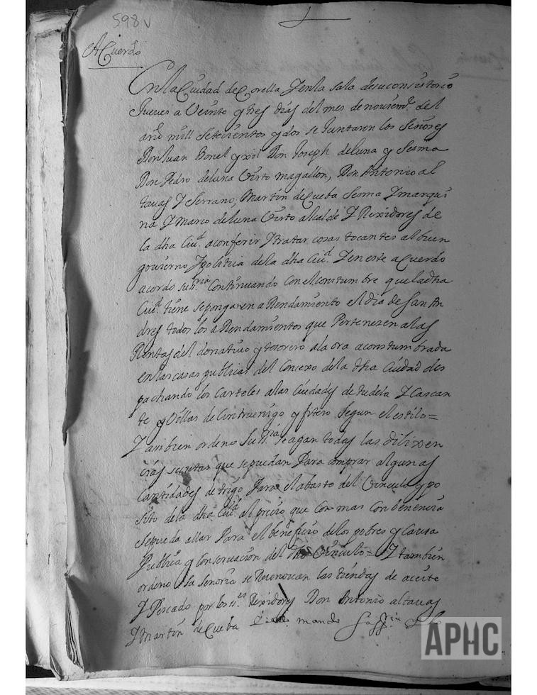 Entre otros asuntos, se acordó que, según costumbre, del día de San Andrés, se pongan en arrendamiento, todos los arrendamientos que pertenecen a las rentas y al donativo y tesorero a la hora acostumbrada en las casas públicas del Consejo de la Ciudad. Una nota indica: “No avido acuerdo el juebes día 30 de noviembre por aversido día de San Andrés apóstol, en que se ampuesto en arrendamiento todos los que tiene la Ciudad de depositario y tesorero, y firma, Ochoa, secretario”. Una nota indica: “No a avido acuerdo día de la Purísima Concepción, por ser día en que la Ciudad, sea allado en las bísperas …., y firma, Ochoa, secretario”. Una nota indica: “No avido acuerdo los días antecedentes por ser vacaciones”.