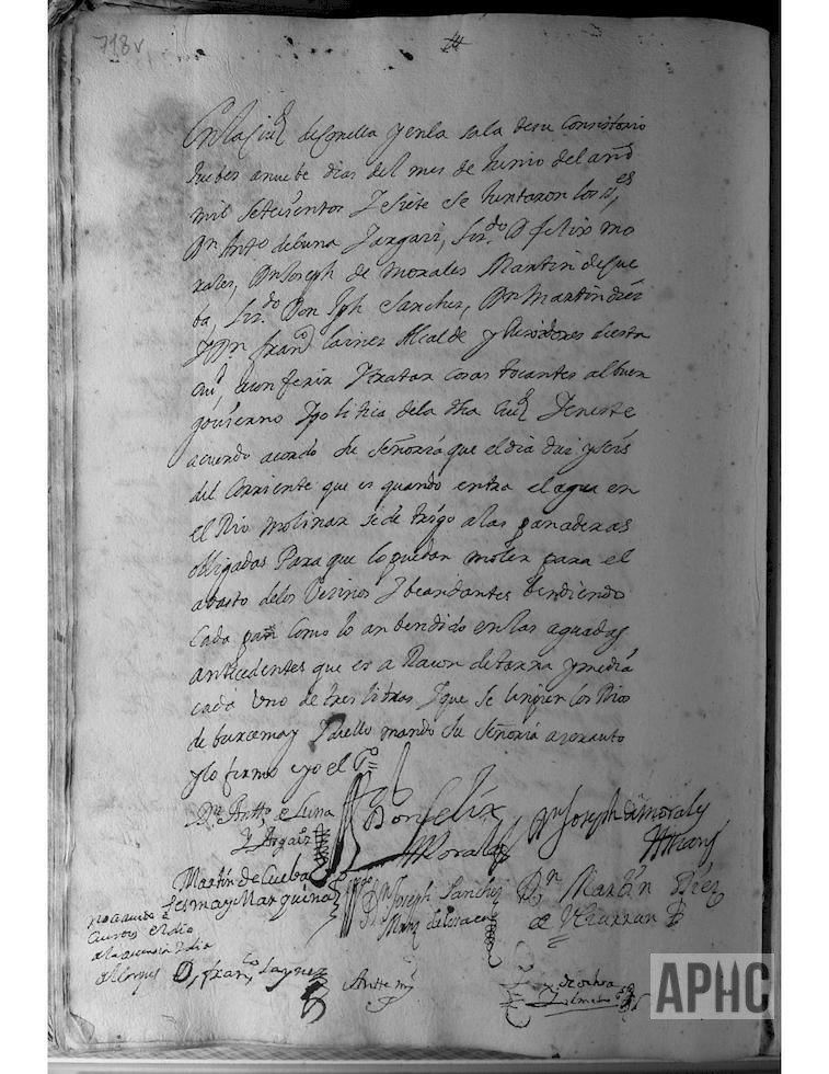 Entre otros asuntos, se acordó que el día 16 del corriente, que es cuando entra el agua en el río Molinar, se dé trigo a las panaderas obligadas, para que lo puedan moler para el abasto de los vecinos, vendiendo cada pan como lo han vendido en las aguadas antecedentes, que es a razón de Tarja y media, cada pan de 3 libras. Hay una nota que dice: “No a avido acuerdos el día de la Ascensión y día del Corpus”.
