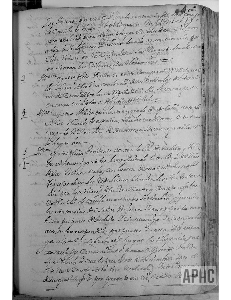 Se juntaron los señores D. Francisco de Ágreda y Ágreda, D. Martín Díez de Ulzurrun y Meca, D. Martín Escudero y Ruiz de Murillo, D, Juan Antonio de San Juan y Echeverría, D. Pedro Miguel de San Juan y Echeverría y Domingo Cueva, Alcalde y Regidores de esta Ciudad, para dejar memoria e instrucción de los pleitos pendientes de la Ciudad, a los señores sus sucesores, en cumplimiento de la obligación de sus oficios y lo dispuesto por leyes de este Reyno, por lo cual hacen la memoria del tenor siguiente: (Se detallan en número de 20).