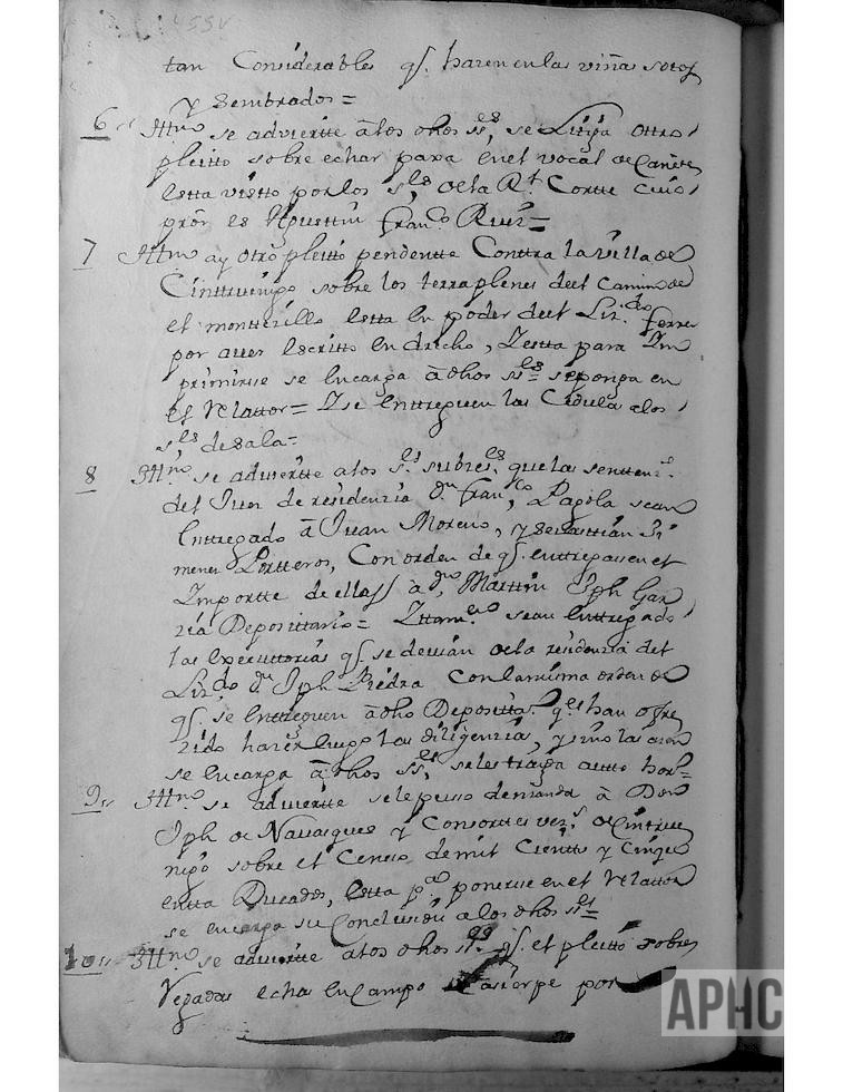 Se juntaron los señores, D. Pedro Miñano y Sesma, D. Martín Díez de Ulzurrun, Joachín Martínez y Sesma, Juan de Baños y Arellano, Antonio Virto y González y Joseph de Luna y Sesma, Alcalde y Regidores de esta Ciudad, para dejar memoria e instrucción de los pleitos pendientes de la Ciudad, a los señores sus sucesores, en cumplimiento de la obligación de sus oficios y lo dispuesto por leyes de este Reyno, por lo cual hacen la memoria del tenor siguiente: (Se detallan en número de 17).