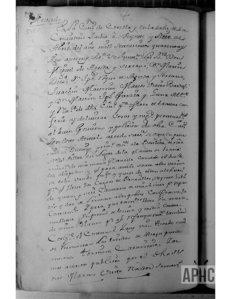 Entre otros asuntos, se acordó se vaya en procesión el domingo primero viniente, a la Basílica de Ntra. Sra. del Villar, en lugar de que se hacía a Ntra. Sra. de Mismanos, por haberla permutado el Ordinario de este Obispado, y que para hacerlo saber a los vecinos se eche bando público y que se dé orden al Tesorero, para que lleve 2 cargas de panecillos, 20 libras de queso y 6 cántaras de vino tinto, para repartir y dar de limosna a los pobres conforme costumbre. Y para que también lleve 1 robo de molletes, 1 pernil de tocino y medio cántaro de vino blanco, para que se refresquen sus señorías.