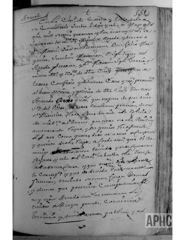 Entre otros asuntos, se acordó que, respecto de que a Ntra. Sra. del Villar, se trajo en solemne procesión de su santa Basílica, hará como 2 años, a la iglesia de Ntra. Sra. del Rosario, por estar dicha basílica amenazando ruina y ser preciso reedificar la iglesia, hará como 4 días se acabó de componer y eliminado dicho riesgo; se acordó que el domingo de la Santísima Trinidad, que se contarán 28 del corriente, se vuelva dicha Imagen a su santa casa, y que ese día se celebre función teniendo sermón, fuegos, danza y demás que pareciere correspondiente.