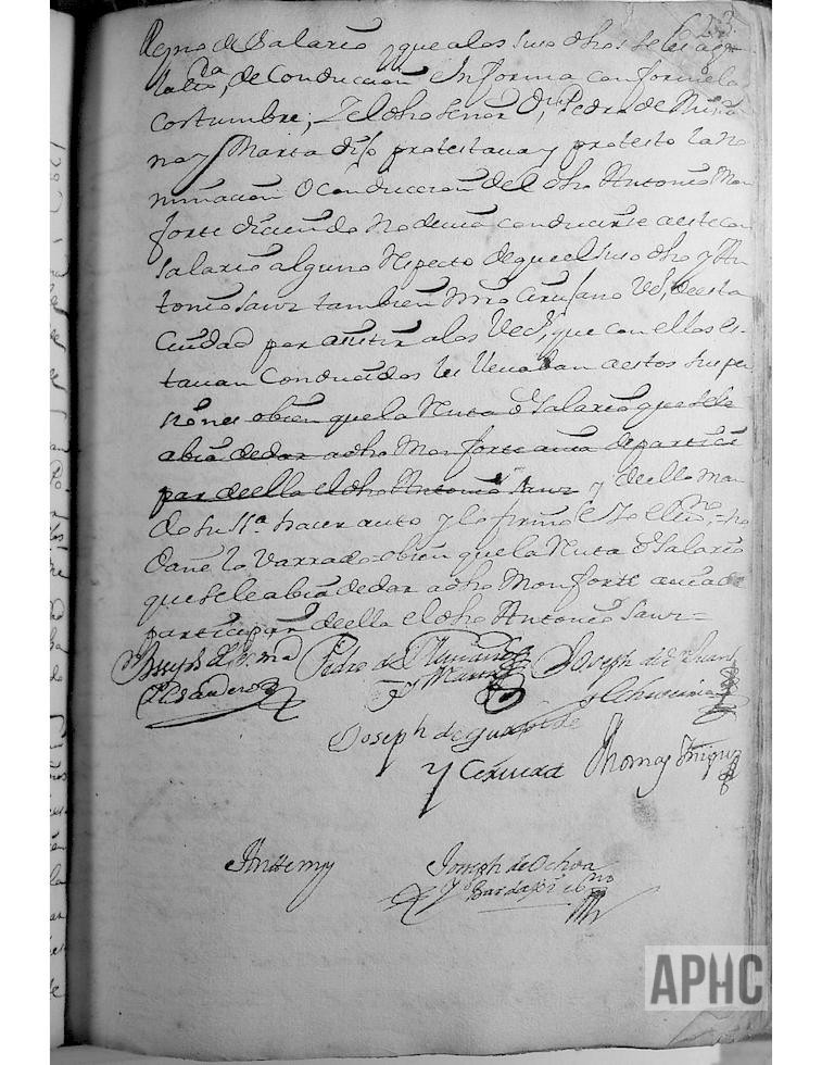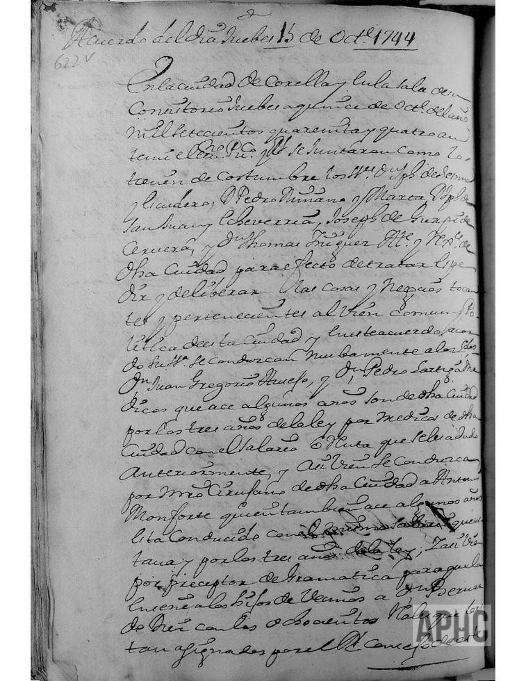 En la Ciudad de Corella y en la sala de su Consistorio, jueves 15 de Octubre de 1744, ante mí el Escribano público, se juntaron como lo tienen de costumbre, los señores D. Joseph de Sesma y Escudero, D. Pedro de Miñano y Marta, D. Joseph de San Juan y Echeverría, Joseph de Gúrpide de Ceruera y D. Thomás Iñiguez, Alcalde y Regidores de esta Ciudad, para efecto de tratar, expedir y deliberar las cosas y negocios tocantes y pertenecientes al bien común y política de esta Ciudad y en este acuerdo acordó su Señoría se conduzcan nuevamente a los licenciados D. Juan Gregorio Ausejo y D. Pedro Santiago, médicos que hace algunos años son de esta Ciudad, por los tres años de la ley, por médicos de esta Ciudad, con el salario o renta que se les ha dado anteriormente y así bien se conduzca por maestro Cirujano a Antonio Monforte, quien también hace algunos años que está conducido con el mismo salario que estaba y por los tres años de la ley. Y así bien por Preceptor de Gramática, para que la enseñe a los hijos de los vecinos, a D. Bernardo Díez, con los 800 reales que están asignados por el Real Consejo de este Reyno. D. Pedro de Miñano y Marta protesta la nominación y conducción de Antonio Monforte, diciendo no debía conducirse a este con salario alguno, respecto de que el dicho y Antonio Sanz, también maestro cirujano vecino de esta Ciudad, por asistir a los vecinos que con ellos estaban conducidos, les llevaban a estos sus pensiones.