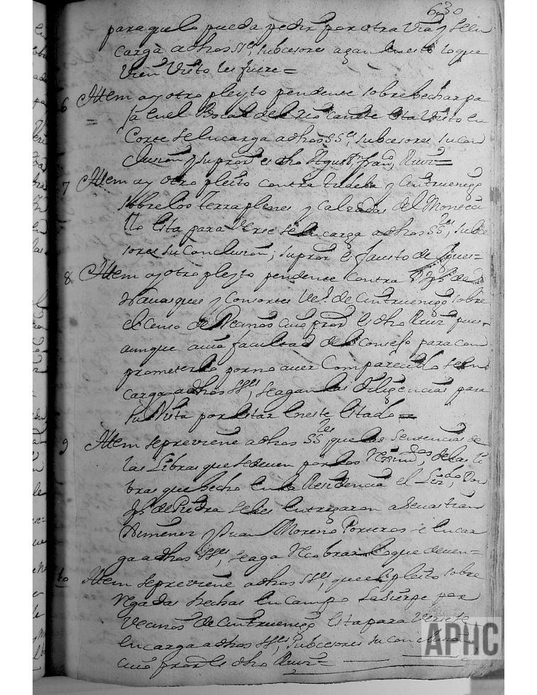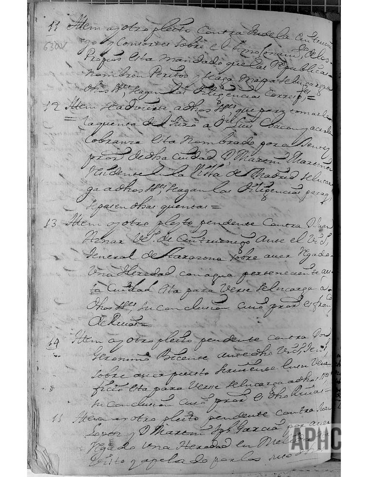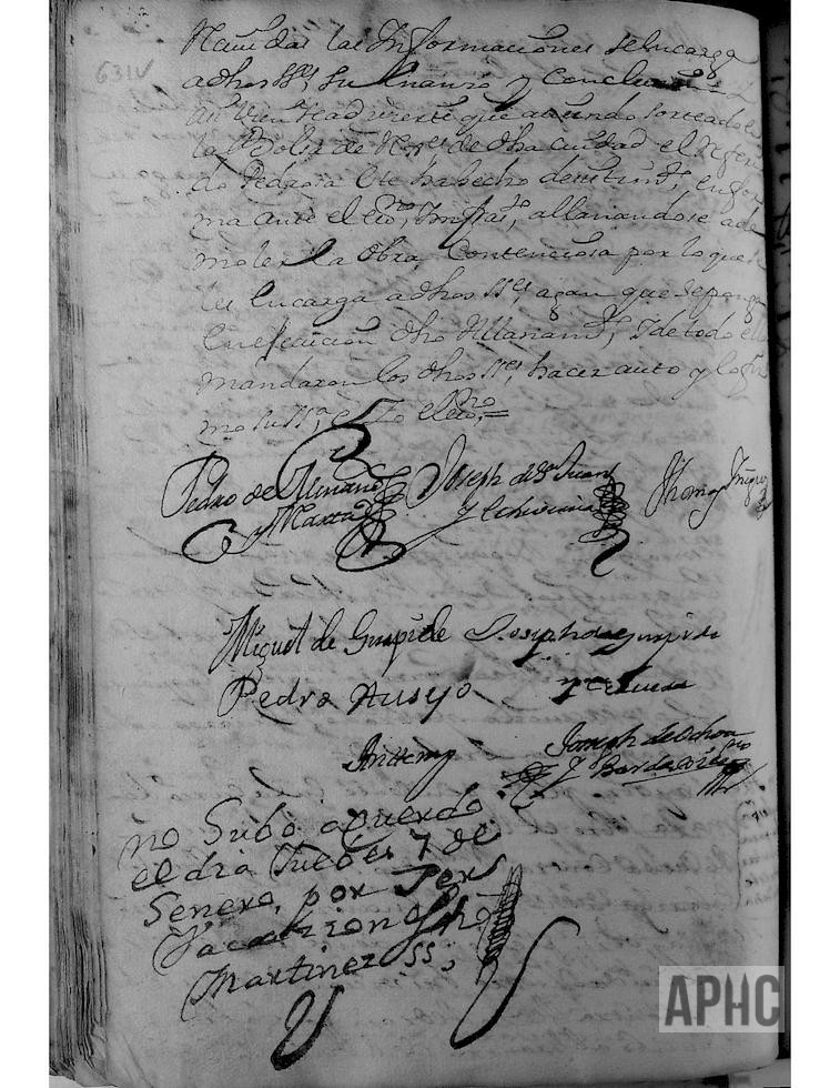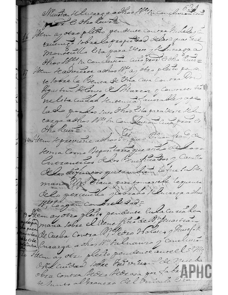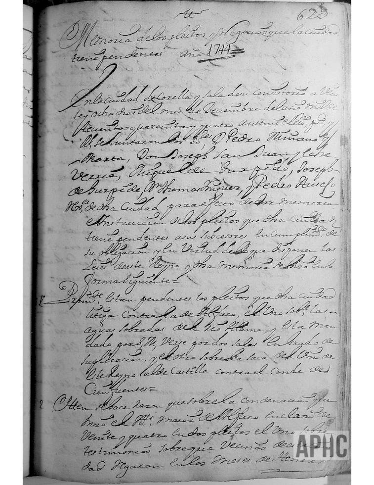 Se juntaron los señores D. Pedro de Miñano y Marta, D. Joseph de San Juan y Echeverría, Miguel de Gúrpide, Joseph de Gúrpide de Ceruera y D. Thomás Iñiguez y Pedro Ausejo, Alcalde y Regidores de esta Ciudad, para dejar memoria e instrucción de los pleitos pendientes de la Ciudad, a los señores sus sucesores, en cumplimiento de la obligación de sus oficios y lo dispuesto por leyes de este Reyno, y dicha memoria se hizo en la forma siguiente: (Se detallan en número de 19).