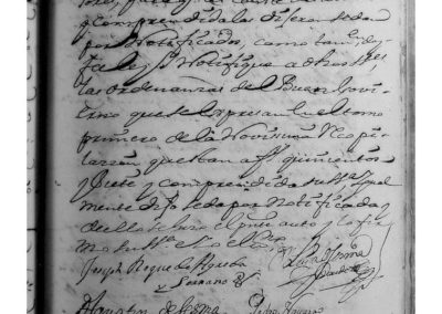 Se juntaron como lo tienen de costumbre, tañida la campana ordinaria, los señores D. Joseph Roque de Ágreda y Serrano, D. Luis de Sesma y Escudero, D. Agustín de Sesma y Escudero, Pedro Navarro y Segura, Antonio Virto y Miguel Balero Virto, (también es Regidor Domingo Virto), Alcalde y Regidores de esta Ciudad, y entre otros asuntos, el Secretario da fe de que notifica a sus señorías las advertencias de los pleitos que dejaron pendientes los señores antecesores, para que les conste a su tenor y comprendido su consentimiento dijeron se dan por notificados, como también da fe de que les notifica las ordenanzas del Buen Gobierno que se expresan en el tomo primero de la Novísima Recopilación que están en folio 507, y comprendidas, dijeron se dan por notificados.