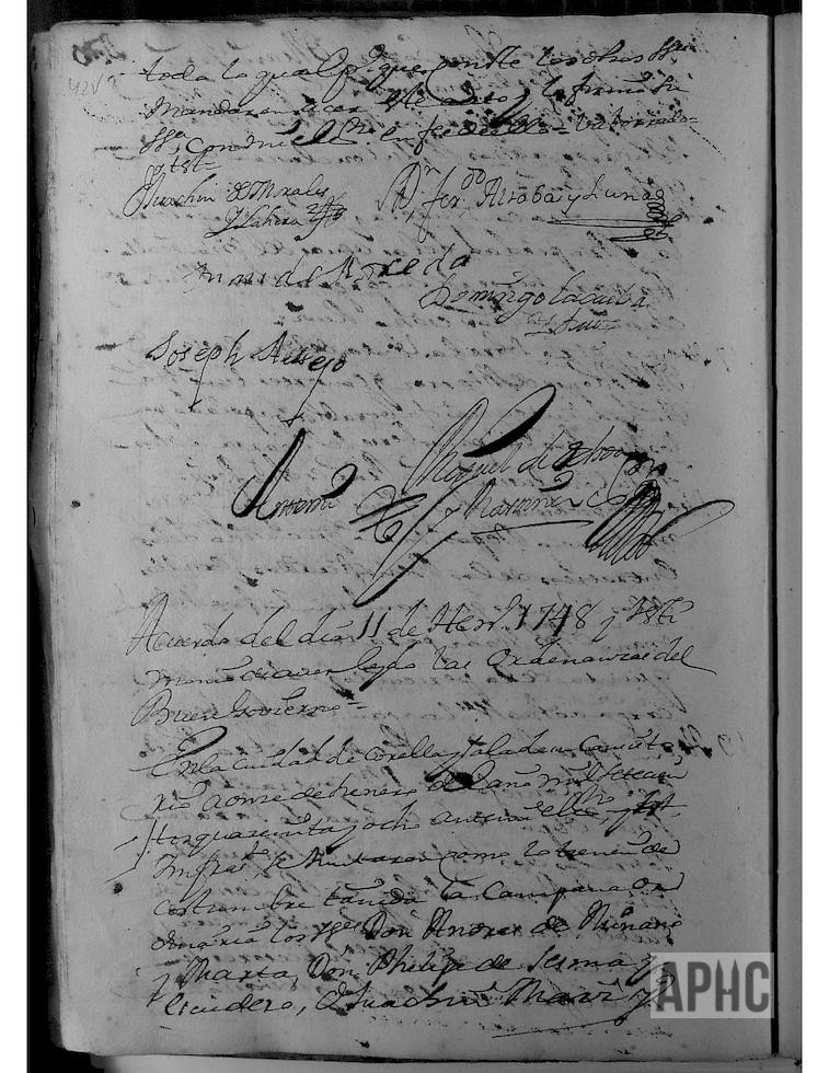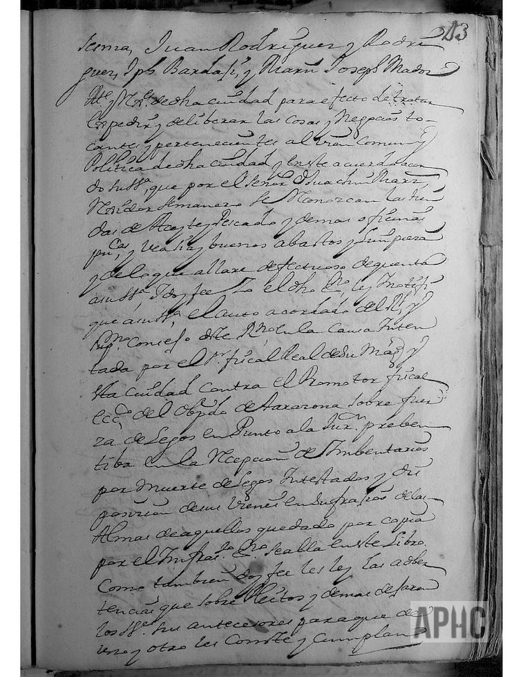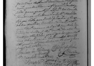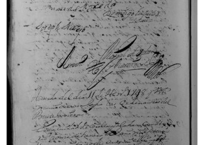 Se juntaron los señores D. Andrés de Miñano y Marta, D. Phelipe de Sesma y Escudero, D. Joachín Martínez y Sesma, Juan Rodríguez y Rodríguez, Joseph Bardaxí y Martín Joseph de Madoz, Alcalde y Regidores de esta Ciudad, ./. y, entre otros asuntos, el Escribano da fe de que lee y notifica a su Señoría el auto acordado del Real y Supremo Consejo de este Reyno en la causa intentada por el señor Fiscal Real de su Majestad y esta Ciudad, contra el promotor fiscal eclesiástico del Obispado de Tarazona, sobre fuerza de Legos en punto a la jurisdicción preventiva, en la recepción de inventario, por muerte de Legos intestados y disposición de sus bienes, en sufragio de las almas de aquellos quedado por copia por el infrascrito Escribano, se halla en este libro. Como también da fe les lee las advertencias que sobre pleitos y demás han dejado sus antecesores, para que de su tenor los conste y cumplan con lo en ellos prevenidos, y comprendido su señoría de todo su contexto, dijo se da por notificada, y así bien da fe de que lee y hace notorias las Ordenanzas del Buen Gobierno que se contienen en el Tomo primero de la Novísima Compilación, que se hallan en folio 507, para que igualmente les conste de su tenor, y enterada su Señoría, dijo que se da por notificada y enterada de ellas.