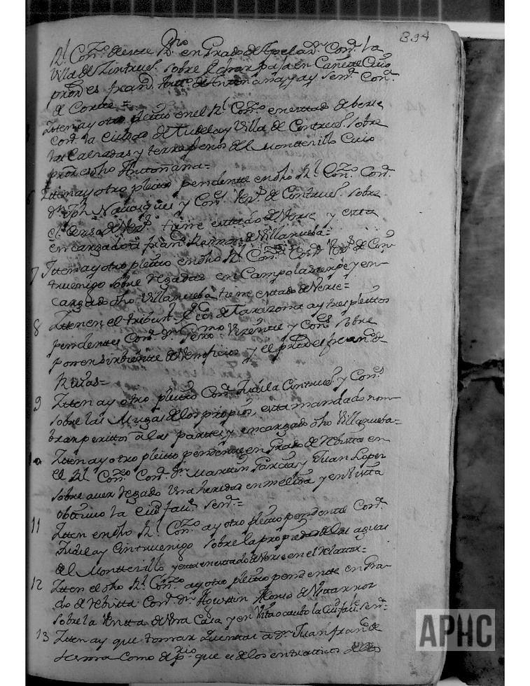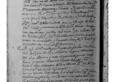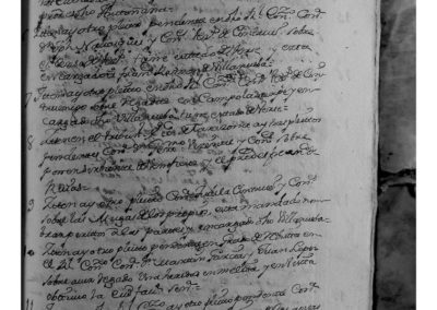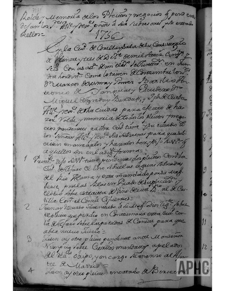 Con asistencia de mí el Escribano, se juntaron en junta ordinaria, como lo tienen de costumbre los señores D. Marcos de Sesma y Gómez, Basilio Antonio de Yanguas y Escudero, D. Miguel de Ágreda y Bardají y Joseph de Cueva y Romeo, Alcalde y Regidores de esta Ciudad, para efecto de hacer el rolde y memoria de todos los pleitos y negocios pendientes que dicha Ciudad tiene, y su estado, a los señores Alcalde y Regidores sus sucesores, para que soliciten en avanzarlos y hacerlos ver, y dijo su Señoría que aquellos son en la siguiente forma: (Se relacionan en número de 23).