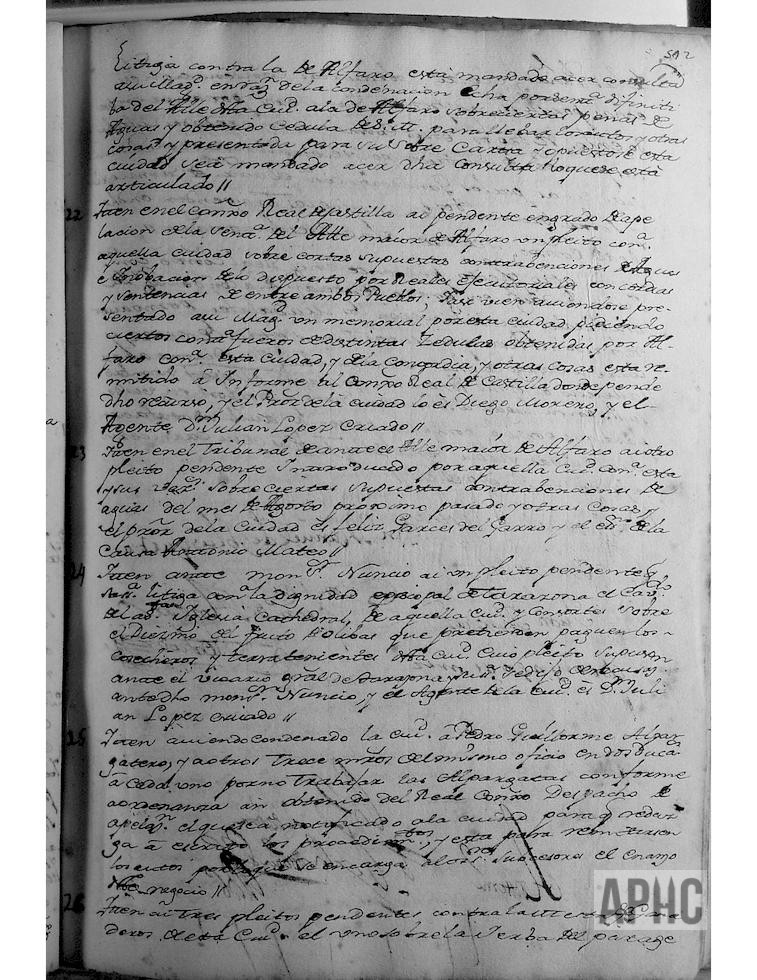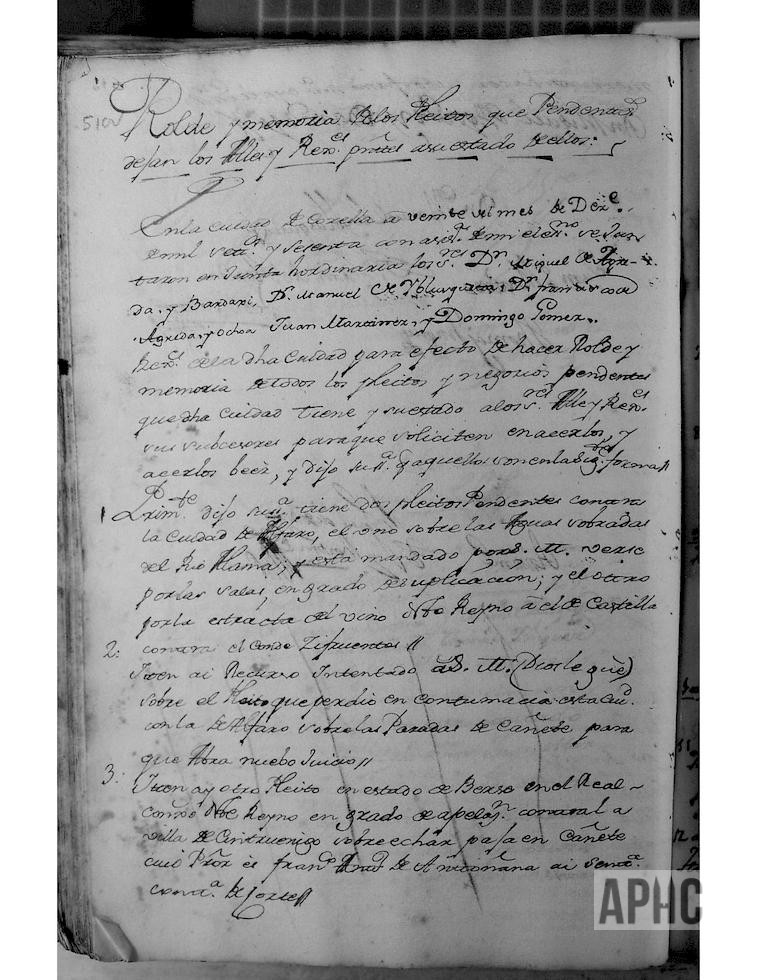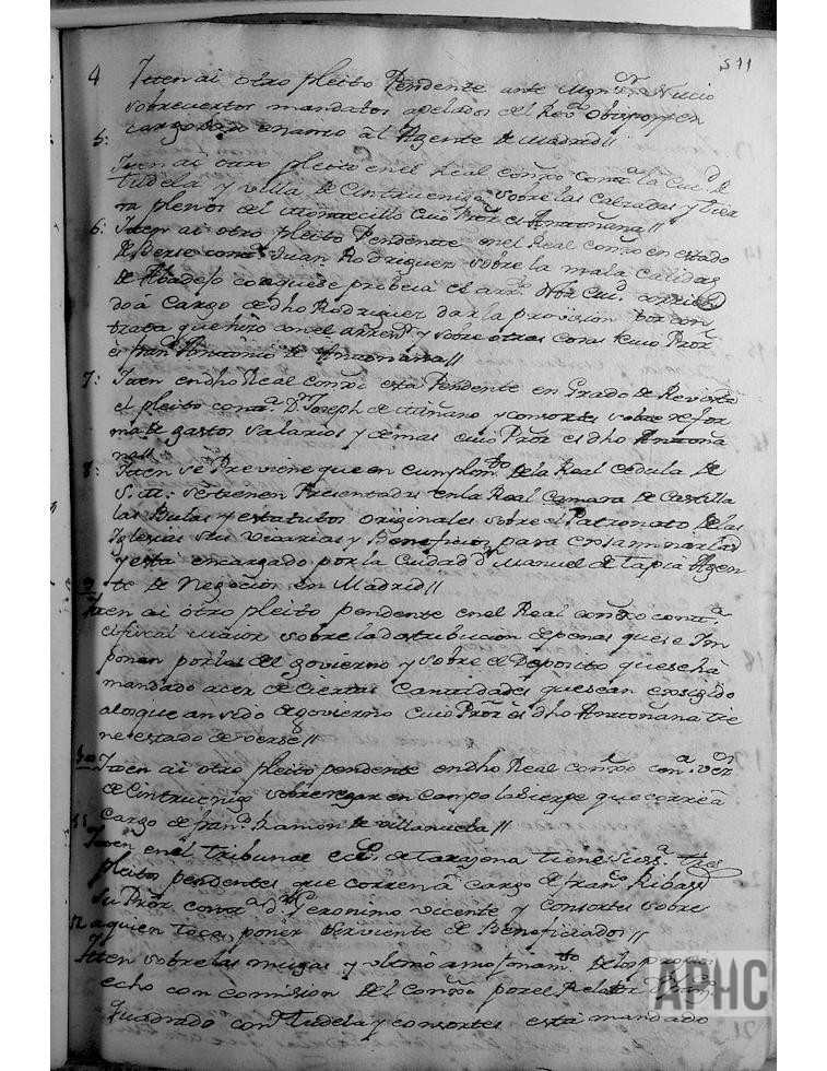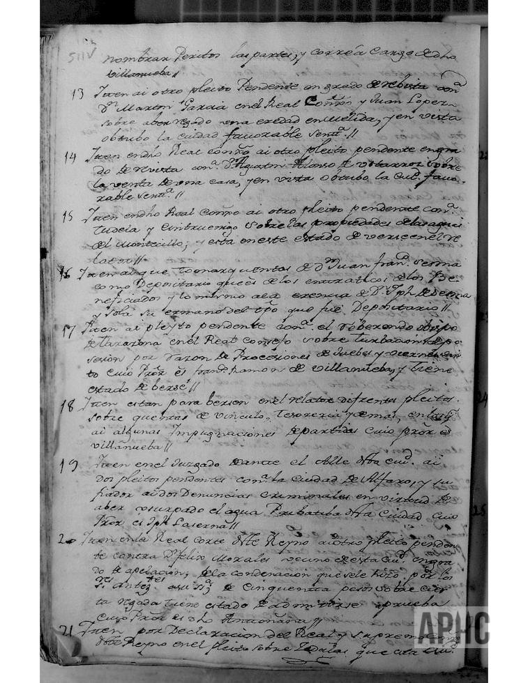 Con asistencia del Escribano, se juntaron en junta ordinaria como lo tienen de costumbre, los señores, D. Miguel de Ágreda y Bardají, D. Manuel de Iblusqueta y Luna, D. Francisco de Ágreda y Ochoa, Juan Martínez y Domingo Gómez y Nesta, Regidores de dicha Ciudad, a efecto de hacer el rolde y memoria de todos los pleitos y negocios pendientes que dicha Ciudad tiene y su estado, a los señores Alcalde y Regidores sus sucesores, para que soliciten en hacerlos y hacerlos ver, y dijo su Señoría que aquellos son en la siguiente forma: (Se relacionan en número de 26).