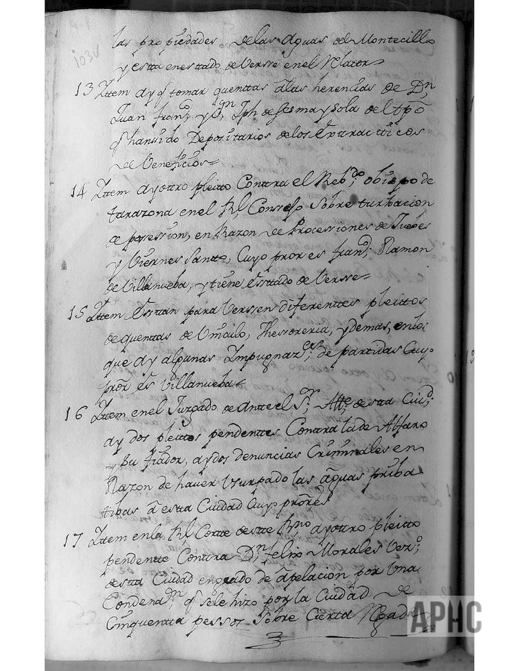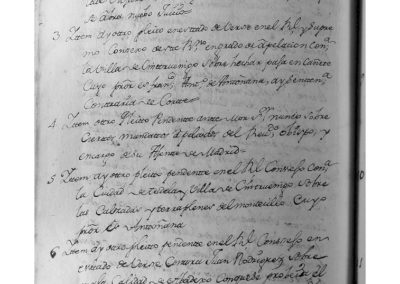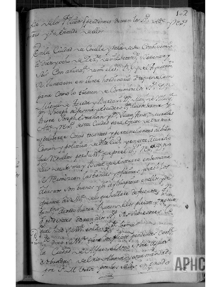 Con asistencia del Escribano público y Real y del Ayuntamiento, se juntaron, en junta ordinaria, a toque de campana, como lo tienen de costumbre, los señores los señores D. Miguel de Ágreda y Bardaxí, D. Manuel de Iblusqueta, D. Joseph de Sesma y Escudero, D. Luis Sesma y Biota, Joseph Estañán, y D. Juan Antonio Morales de Rada, Alcalde y Regidores de la Ciudad, y, entre otros asuntos, se acordó hacer razón de los pleitos y negocios que, pendientes dejan a los señores sucesores, lo cual hizo su señoría en la siguiente forma: (Se relacionan en número de 26).