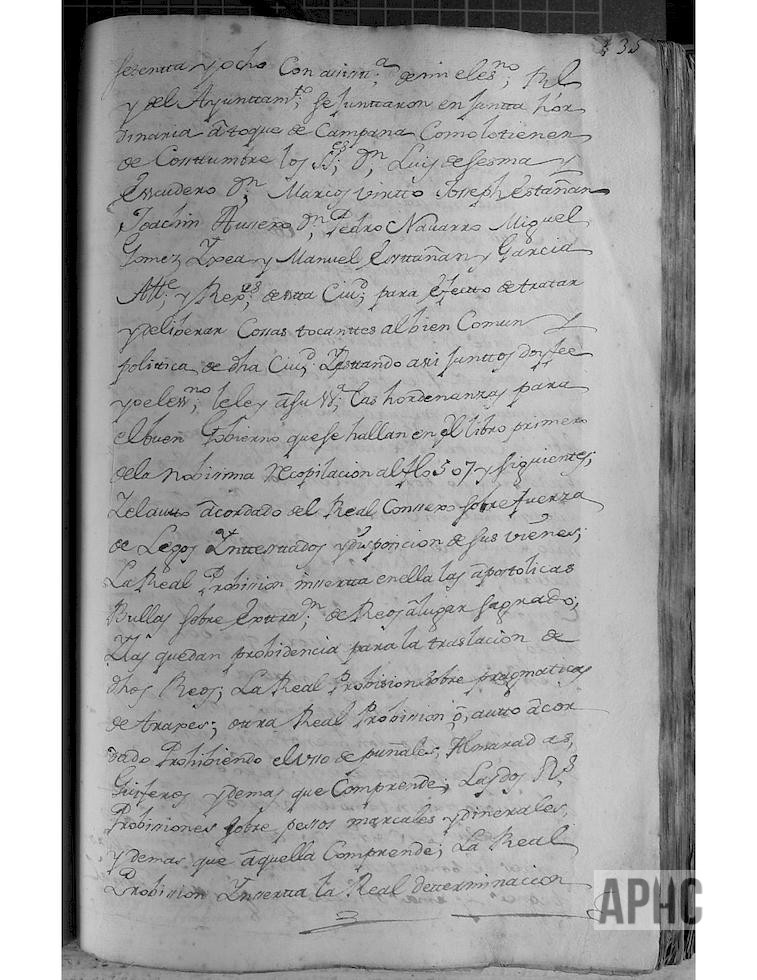 Se juntaron en junta ordinaria, a toque de campana, los señores D. Luis de Sesma y Escudero, D. Marcos Virto y Bardaxí, Joseph Estañán, Joachín Ausejo, D. Pedro Navarro y Segura, Miguel Gómez Igea y Manuel Estañán y Pardo y García, Alcalde y Regidores, para efecto de tratar y deliberar, cosas tocantes al bien común y política de dicha Ciudad, y estando así juntos, doy fe yo el Escribano les leí a su Señoría las Ordenanzas del buen Gobierno que se hallan en el Libro Primero de la Novísima Recopilación en folio 507 y siguientes, el auto acordado por el Real y Supremo Consejo de este Reino, sobre fuerza de legos intestados y disposiciones de sus bienes, la Real Provisión insertas en ella, las Apostólicas Bulas sobre extracción de los reos de lugar sagrado, y las que van Providencia para el traslado de estos reos, la Real Provisión sobre Pragmática de trajes, otra Real Provisión o auto prohibiendo el que ninguna persona pueda llevar puñales, almaradas, guiferos, y demás que comprende, las dos Reales Provisiones sobre pesos mancales y dinerales y demás que aquellas comprenden; la Real Provisión inserta, la Real determinación que manda no se permita salir a los dominios de España, a clérigo ni fraile español que no presente licencia de Su Majestad, la Real Provisión que manda a los Alcaldes que expresa den noticia al Fiscal Mayor de los delitos que comprende, la carta de orden del Excmo. Sr. Conde de Gajes, virrey que fue de este Reino, para que se le dé sobre desertores; la Real Provisión para que las justicias de este Reino, den aviso de todas las vacantes que se tienen de beneficios y otros cargos; la Ley 42 del cuaderno de las últimas Cortes, sobre compras y ventas de uvas y mosto; el Despacho proveído por el Real Consejo, a pedimento del Sr. Patrimonial, en 28 de noviembre del año pasado de 1766, que den declaración jurada del estado en que dejan los caminos, al concluir de sus empleos, de que quedó su señoría advertido. Respecto a la ley 52, de las últimas Cortes, sobre tasa y precio a los Jornaleros, peones y demás oficiales, que ganan jornal, durante el presente año, acordó su Señoría suspenderlo hasta otro día. Se nombra Depositario de los graneros del Vínculo, por haber muerto Bernardo del Arenal, a Juan Joseph Ximénez, vecino de esta Ciudad, con el salario de 150 reales.