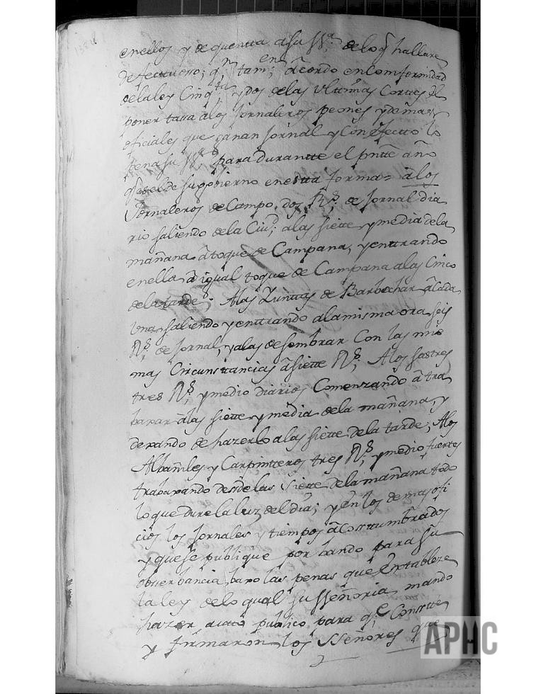 Entre otros asuntos, se acordó, en conformidad con la ley 52, de las últimas Cortes, el poner tasa a los jornaleros y oficiales que ganan un jornal, y con efecto lo pone su señoría, para el presente año de su gobierno, en esta forma: A los jornaleros de campo, 2 reales de jornal diario, saliendo de la Ciudad a las 7 ½ de la mañana, a toque de campana, y entrando en ella a igual toque de campana a las 5 de la tarde. A las yuntas de barbechar, a cada una, saliendo y entrando a la misma hora, 6 reales de jornal, y a las de sembrar, con las mismas circunstancias, a 7 reales. A los sastres, 3 ½ reales diarios, comenzando a trabajar a las 7 y media de la mañana y dejando de hacerlo a las 7 de la tarde. A los albañiles y carpinteros, 3 ½ reales fuertes, trabajando desde la 7 de la mañana, todo lo que dure la luz del día. Y en los demás oficios, los jornales y tiempos acostumbrados, y que se publique por bando, para su observancia, bajo la pena que establece la ley.