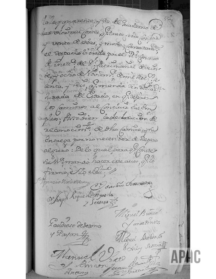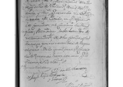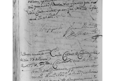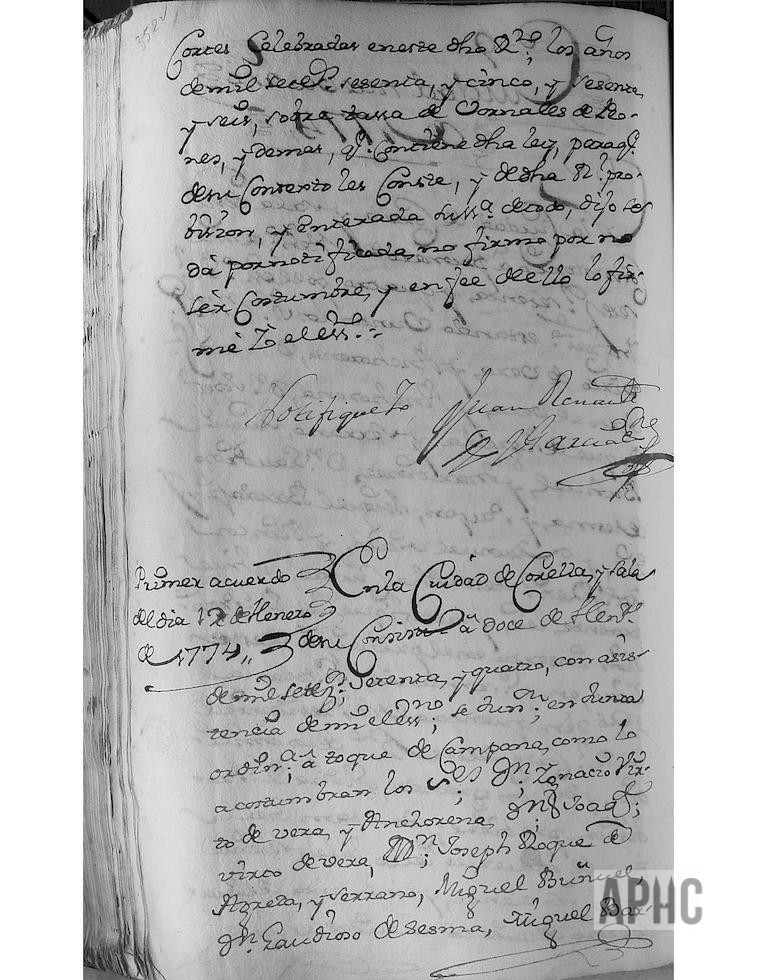 Con asistencia del Escribano del Ayuntamiento, se juntan en Junta Ordinario, a toque de campana, como lo acostumbran, los señores D. Ignacio Virto de Vera y Anchorena, D. Joaquín Virto de Vera y Anchorena, D. Josef Roque de Ágreda y Serrano, Miguel Buñuel y Martínez, D. Gaudioso de Sesma y Payán, Miguel Bardají Gil y Sesma y Manuel Virto y Rincón, Alcalde y Regidores de esta Ciudad, y, entre otros asuntos, doy fe yo el Escribano leí a su Señoría, las Ordenanzas del buen Gobierno que se hallan en el primer tomo de la Novísima Recopilación, folio 507 y siguientes, como también la doy de haberles leído el auto acordado por el Real y Supremo Consejo de este Reino, sobre fuerza de legos intestados y disposiciones de sus bienes, como también las dos Reales Provisiones sobre pesos mancales y dinerales que comprende; Asimismo la Real Provisión inserta en ella, las Apostólicas Bulas sobre extracción de reos de lugar sagrado, y las que van Providencia para extraerlos; Como también el auto acordado y Real Provisión sobre armas de fuego, cortas, pistolas, guiferos, navajas y cuchillos de punta que se prohíben y demás que comprenden; Como también la Real Provisión sobre Pragmática de trajes; asimismo la Real Provisión inserta, la Real determinación que manda no se permita salir de los dominios de España, a clérigo ni fraile español que no presentare licencia por Su Majestad; como igualmente otra Real Provisión que manda a los Alcaldes y demás que expresa, dar cuenta al Fiscal Mayor de los delitos que contiene; como también la carta orden del Excmo. Sr. Conde de Gajes, virrey de este Reino, para que se le dé sobre desertores; asimismo la Real Provisión por patente, para que las Justicias de este Reino, den aviso de todas las vacantes de beneficios que hubiere y de otras plazas públicas que comprende; Así bien la Ley 42 del cuaderno de las últimas Cortes, que trata sobre compra y venta de uvas y mosto; Como también el Despacho librado por el Real Consejo de Instancia del Sr. Patrimonial, de 28 de noviembre de 1766, que manda den declaración jurada del estado en que dejaren los caminos, al concluir sus empleos; así bien, la declaración del reconocimiento de dicho camino y su entrega, por no necesitar de reparo alguno.
