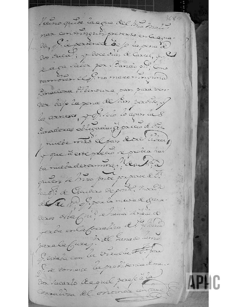 Atendido las quejas de los arrendadores del Molino de Enmedio, sobre falta de agua, se acordó que, ningún vecino, con ningún pretexto en la aguada, quite el agua en el río Molinar, bajo la pena de 2 ducados y 12 días de cárcel, y que se haga saber por bando. También, que ninguna panadera aventurera, venda pan, bajo la pena de pan perdido y los arneses, y que sólo vendan pan las panaderas obligadas y al precio de 19 maravedís el pan de 3 libras, y que sea a este precio, hasta nueva determinación.