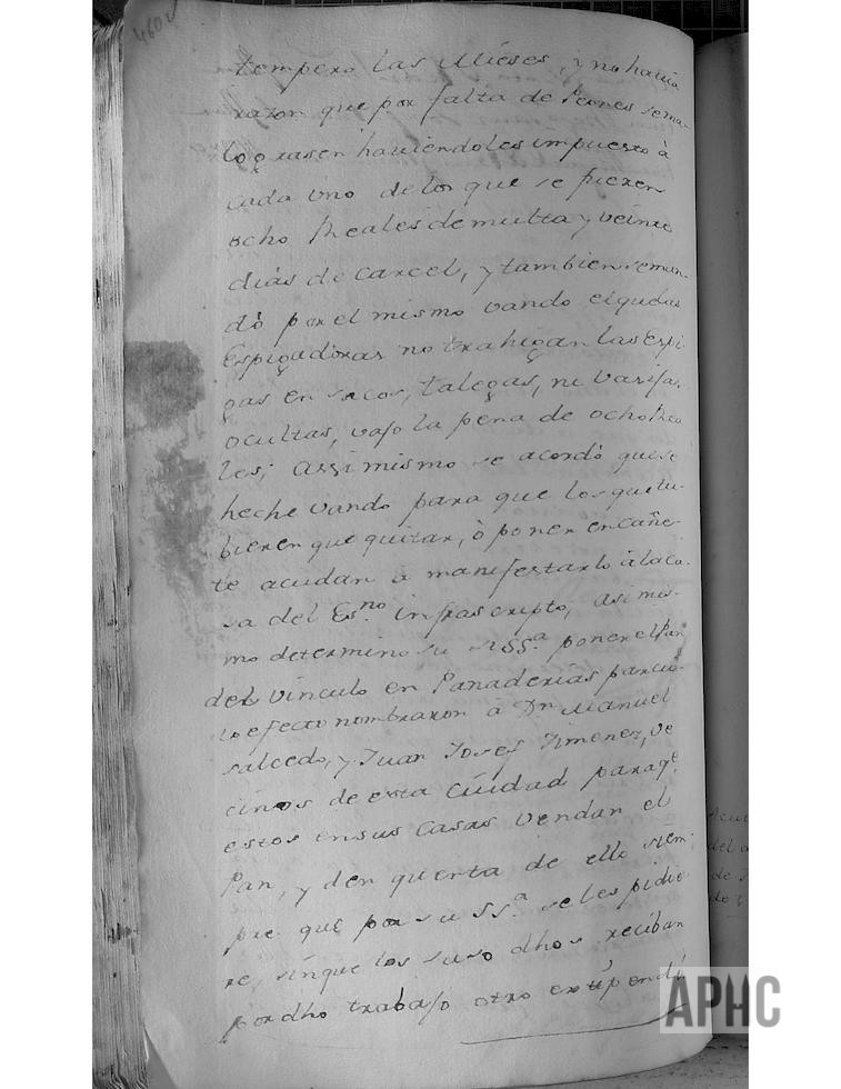 Entre otros asuntos, se acordó echar bando público, para que ningún trabajador en ejercicio de bracero, saliese a segar mieses a los pueblos fuera de esta Ciudad, por la grave necesidad que hay en ella, por razón de las excesivas calores que han traído a tempero las mieses, y no había razón para que, por falta de peones, se malograsen; la pena que se impondría sería de 8 reales de multa y 20 días de cárcel; y también que las espigadoras no traigan las espigas en sacos, talegas o vasijas ocultas, bajo pena de 8 reales. Se determinó poner el pan del Vínculo en panaderías y nombraron a D. Manuel Salcedo y Juan Josef Jiménez, vecinos de esta Ciudad, para que en sus casas, venda el pan y den cuenta de ello, siempre que por su Señoría se les pidiese, sin que reciban por dicho trabajo, otro estipendio que el de 12 maravedís por carga de pan que vendieren, y que el pan lo reciban bien cocido y razonable de las panaderas.