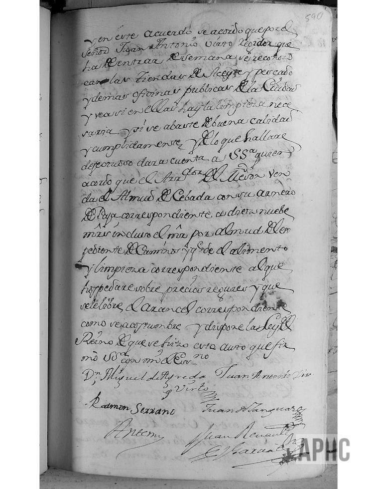 Entre otros asuntos, se acordó que el arrendador del Mesón, venda el almud de cebada, con su arnero de paja correspondiente, a 9 maravedíes, incluido el maravedí por almud del expediente de caminos, y que guarde el alimento y limpieza correspondiente al que se hospedase.