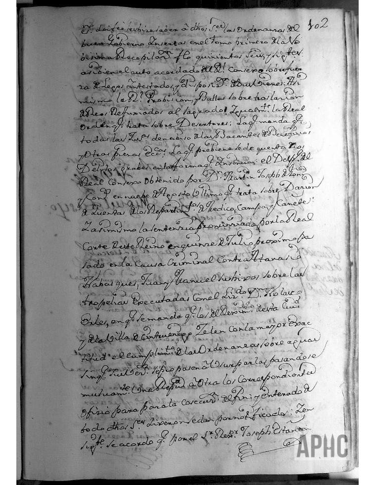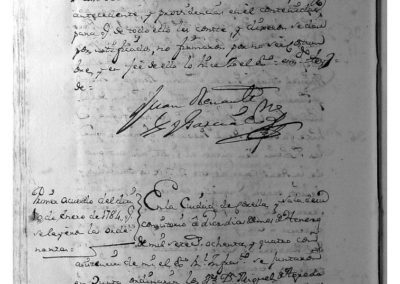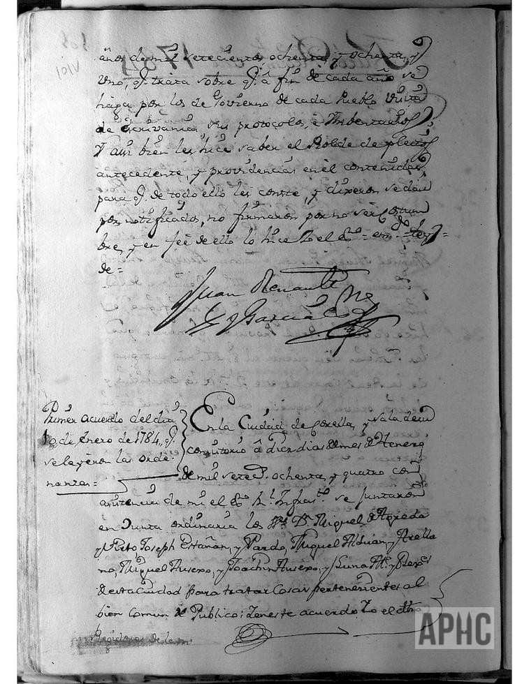 En la Ciudad de Corella y Sala de su Consistorio, a 10 de enero de 1784, con asistencia de mí el Escribano Real infrascrito, se juntaron en junta ordinaria, los señores D. Miguel de Ágreda y Virto, Joseph Estañán y Pardo, Miguel Alduán y Arellano, Miguel Ausejo y Gascón y Joachín Ausejo y Luna, Alcalde y Regidores de esta Ciudad, para tratar cosas pertenecientes al bien común de público, y en este acuerdo, yo el Escribano infrascrito, doy fe les hice saber a los dichos Señores las Ordenanzas del Buen Gobierno, insertas en el tomo Primero de la Novísima Recopilación, folio 506 y siguientes; Así bien el auto acordado del Real Consejo sobre fuerza de legos intestados y disposición de sus bienes; Así mismo, la Real Provisión y Bulas sobre traslación de reos refugiados al sagrado; Igualmente la Real Orden que trata sobre desertores; la que manda que todas las Justicias, den aviso de las vacantes de beneficios y otras plazas eclesiásticas; La que previene se dé cuenta de los delitos graves, en la forma que insinúa. El despacho del Real Consejo, obtenido por D. Martín Joseph de Goñi y consortes, en 9 de agostó último, que trata sobre dación de cuentas de los repartimientos a Médico, Campo y Cañete; Y así mismo, la sentencia pronunciada por la Real Corte de este Reino, en 15 de julio próximo pasado, en la causa criminal contra Atanasio Navascués, Juan y Manuel, sus hijos, sobre las tropelías ejecutadas con el Licenciado D. Nolasco Erles, en que se manda, que los del Regimiento de esta Ciudad y los de la villa de Cintruénigo, celen con la mayor exactitud el cumplimiento de las ordenanzas, sin que sus vecinos se propasen a usurparlas, pasándose mutuamente una República a otra los correspondientes oficios para la consecución del fin, y enterado de todo dichos señores, dijeron se dan por notificados. (Miguel de Guesca y Alfaro, Escribano).