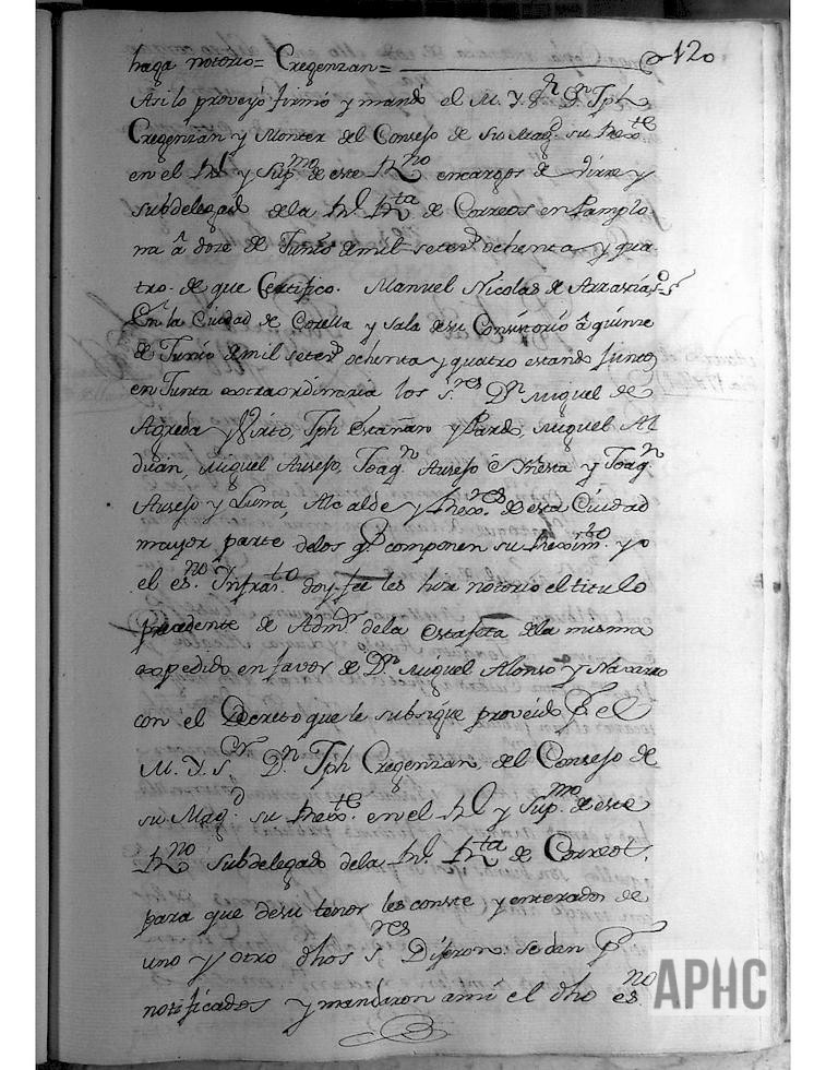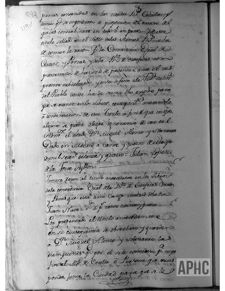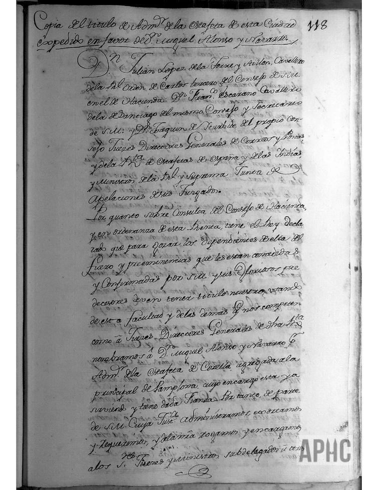 Se deja constancia del Título de Administrador de la Estafeta de Corella, expedido a favor de D. Miguel Alonso y Navarro, Administrador de la estafeta de Corella, agregada a la principal de Pamplona.