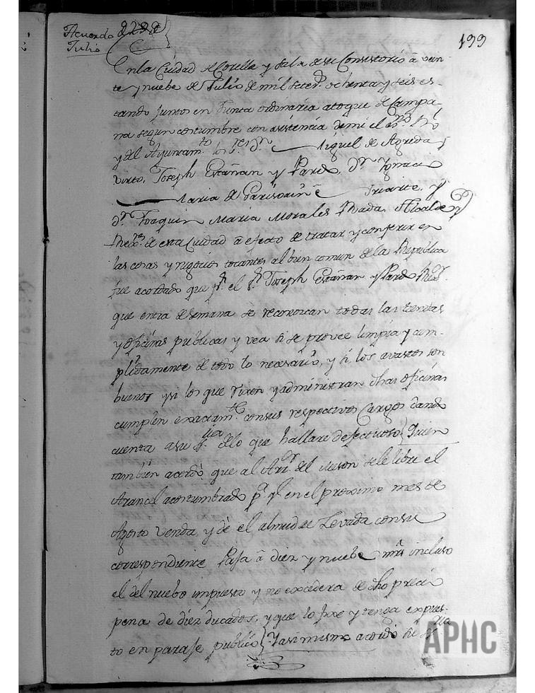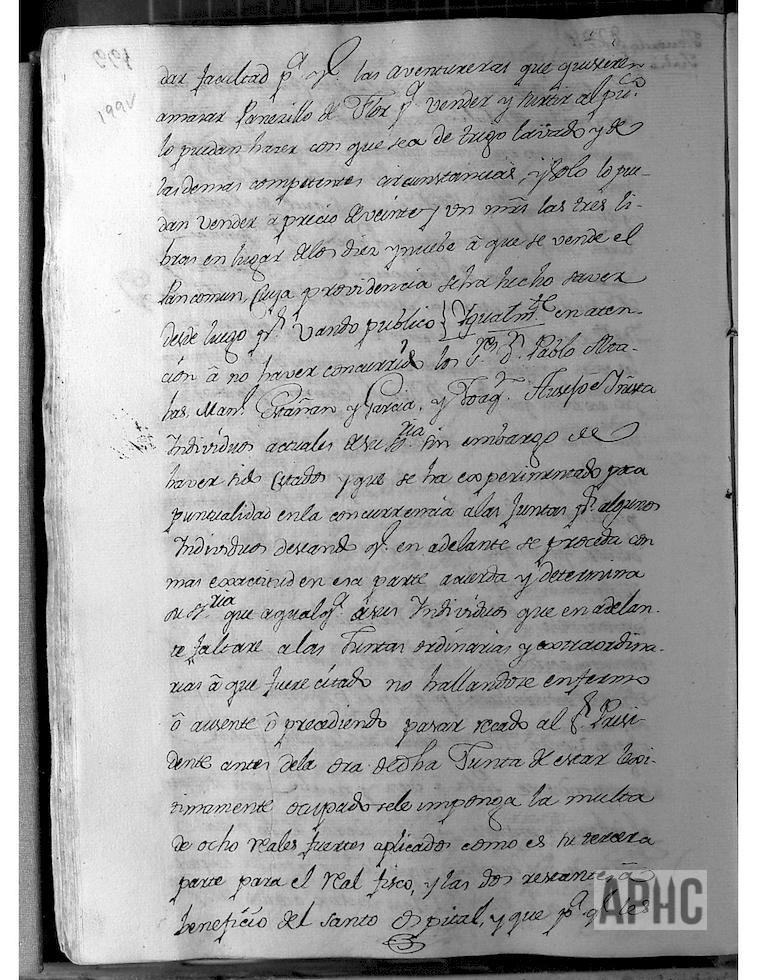 Entre otros asuntos, se acordó que, en atención a la ausencia a esta sesión de los Regidores D. Pablo Altabas, Manuel Estañán y García y Joaquín Ausejo e Inesta, sin embargo de haberles citado y que se ha experimentado poca puntualidad en la concurrencia a las juntas, por algunos individuos, deseando solucionar este asunto, acuerda y determina su Señoría que cualquiera de sus individuos que, en adelante, faltare a las Juntas ordinarias o extraordinarias, a que fuere citado, no hallándose enfermo o ausente o procediendo pasar recado al Sr. Presidente, antes de la hora de dicha Junta, de estar legítimamente ocupado, se le impondrá la multa de 8 reales fuertes, aplicados, como es su tercera parte para el real fisco, y las otras dos restantes a beneficio del Santo Hospital, y para que les conste a dichos D. Pablo Altabas, Manuel Estañán y García y Joaquín Ausejo e Inesta, se les haga notorio por el escribano infrascrito.