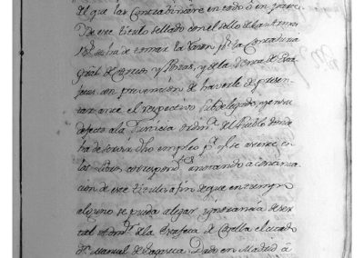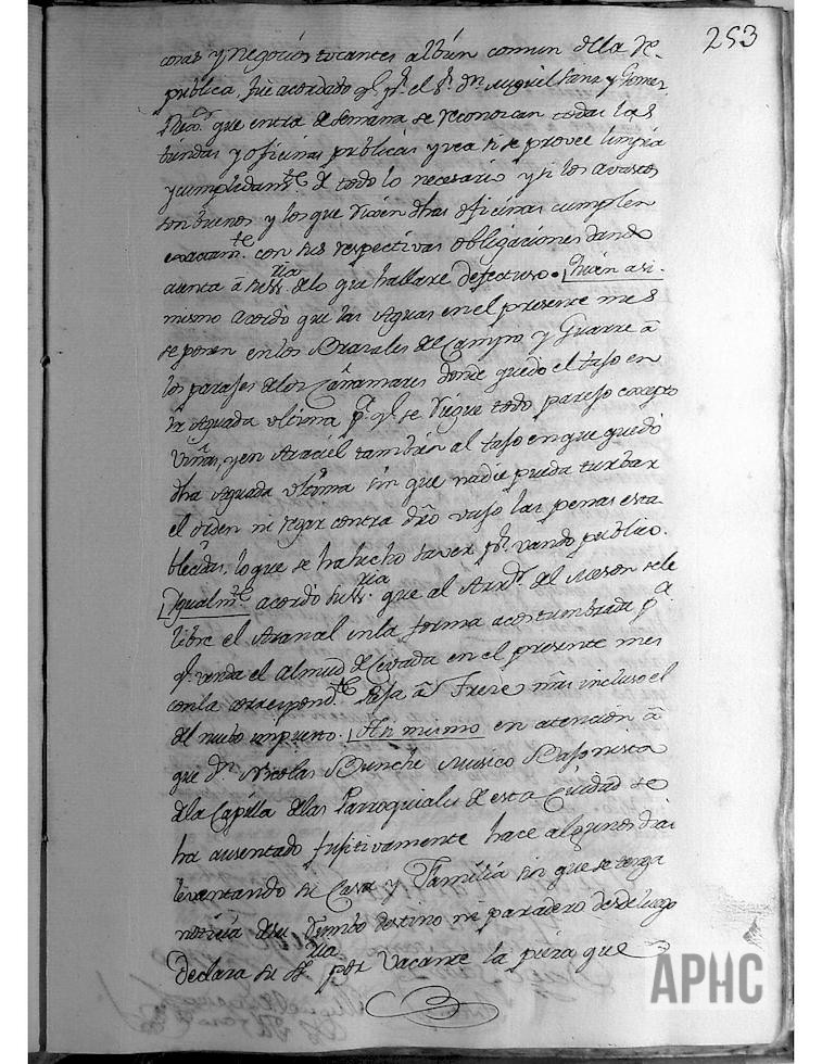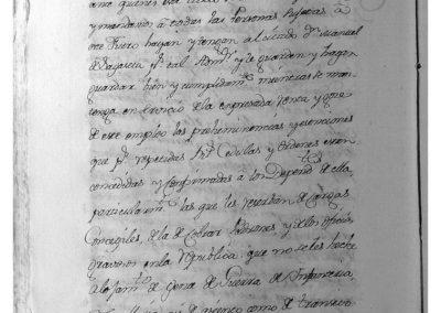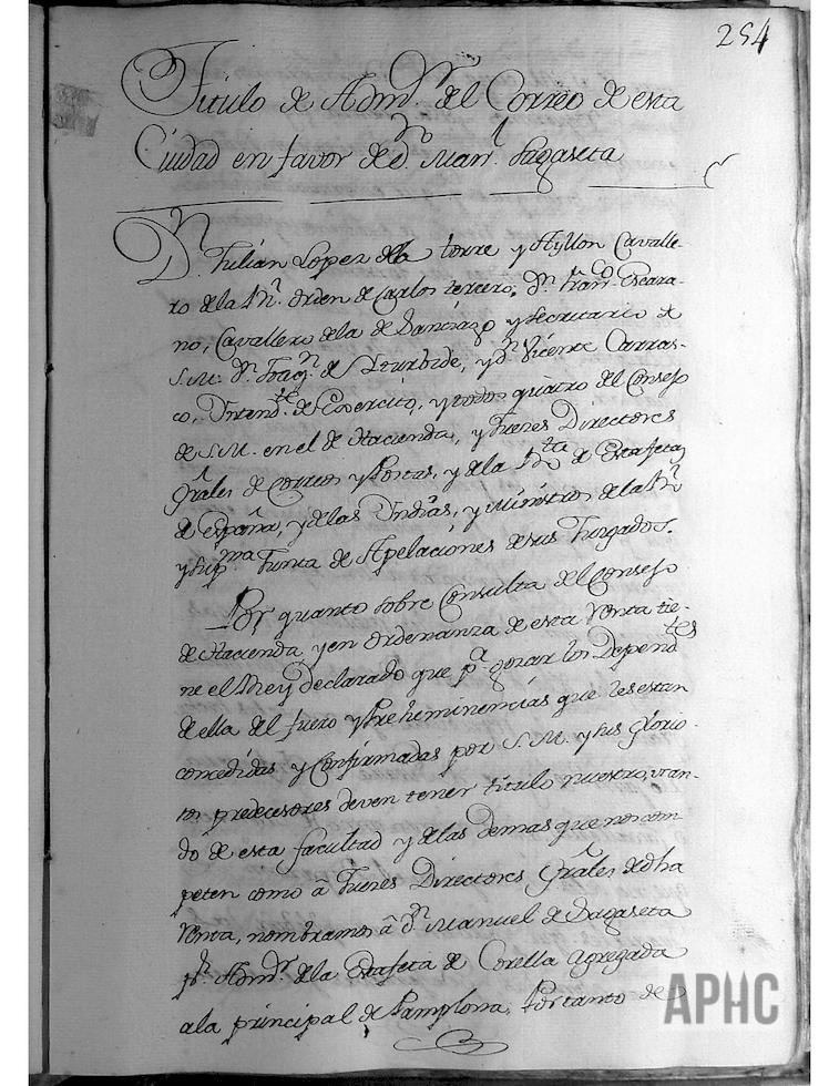 Entre otros asuntos, y por haberse ausentado de la Ciudad, levantando su casa y familia, sin haber informado a su Señoría, se acordó vacante el empleo de dicho músico de la Capilla Parroquial de esta Ciudad, y que se expidan los correspondientes edictos, para que puedan concurrir los interesados. Igualmente se acordó que, los que hagan levantaderos en el río Ampol o en cualquier otro, para regar sus heredades, no puedan dejar sus estacas ni embarazos, sino que lo quiten todo luego que concluyan de regar, bajo la pena de 8 reales y que se haga saber por bando público. A continuación figura la concesión de Título de Administrador del Correo de Corella, en favor de D. Manuel de Sagaseta.