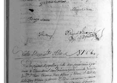En la Ciudad de Corella y Sala de su Consistorio a 1 de Enero del año 1788, estando juntos, los señores D. Juan Fermín Virto de Vera y Tabar, D. Francisco de Sales Virto de Vera y Sesma, D. Pedro Navarro y Segura, Miguel Catalán y Lázaro, D. Benito Alonso y Navarro y D. Miguel Sanz y González, Alcalde y Regidores de esta Ciudad, yo, el escribano infrascrito, doy fe, les notifiqué e hice saber la Real Provisión que manda que las Justicias, den cuenta al señor Alcalde más antiguo de la Real Corte de este Reino, de los homicidios y delitos graves, que aquella contiene, la cual se halla en el principio de este libro, también la ley 62, de las últimas Cortes celebradas los años 1765 y 1766, sobre tasa de jornaleros, peones y oficiales; Así bien la ordenanza que trata sobre nombramiento de Priores y Mayorales. Así bien la ley de las últimas Cortes, celebradas en la ciudad de Pamplona, los años de 1780 y 1781, que trata sobre que, a fin de año, se haga por los del Gobierno de cada Pueblo, visita de escribanía, sus protocolos e inventarios; Y así bien les hice saber el Rolde de pleitos antecedente y providencias en él contenidas, para que de todo ello les conste y dijeron se dan por notificados, no firmaron por no ser costumbre, y en fe de ello, firmo yo el Escribano. Miguel de Guesca y Alfaro.