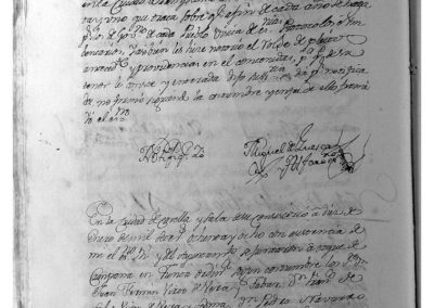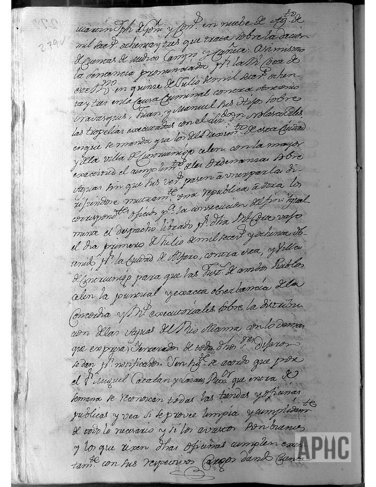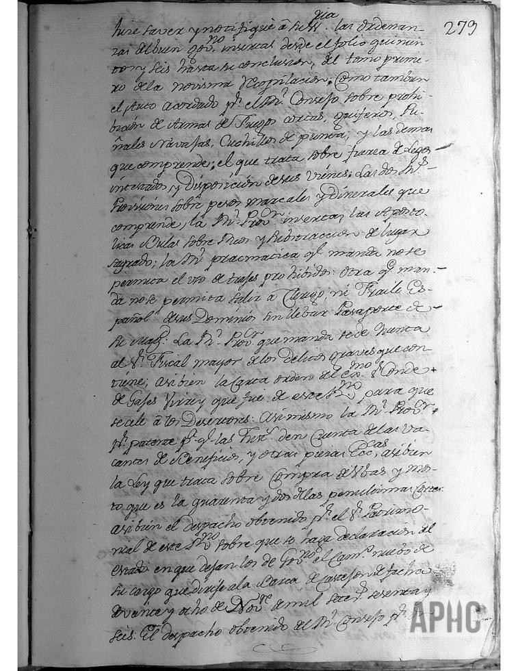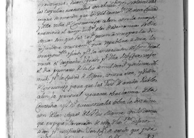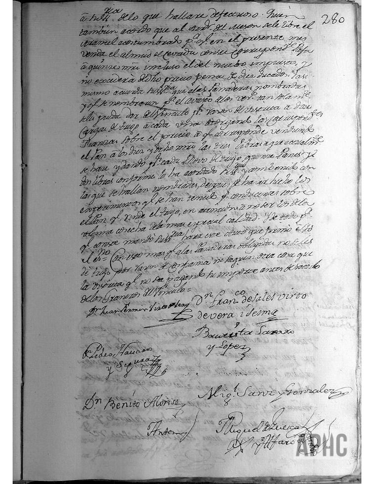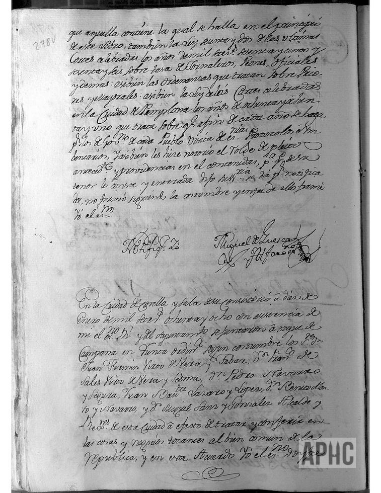 En la Ciudad de Corella y Sala de su Consistorio a 1 de Enero del año 1788, con asistencia de mí el escribano real y del Ayuntamiento, se juntaron a toque de campana, en Junta ordinaria, según costumbre, los señores D. Juan Fermín Virto de Vera y Tabar, D. Francisco de Sales Virto de Vera y Sesma, D. Pedro Navarro y Segura, Juan Bautista Lázaro y López, D. Benito Alonso y Navarro y D. Miguel Sanz y González, Alcalde y Regidores de esta Ciudad, a efecto de tratar y conferir en las cosas y negocios tocante al bien común de la república, y en este acuerdo, yo, el escribano, doy fe, hice saber y notifiqué a su Señoría las Ordenanzas del Buen Gobierno, insertas desde el folio 506 hasta su conclusión, del tomo primero de la Novísima Recopilación; como también el auto acordado del Real Consejo sobre prohibición de armas de fuego cortas, guíferos, puñales, navajas, cuchillos de punta, y las demás que comprende; el que trata sobre fuerza de legos intestados y disposición de sus bienes; las dos reales Provisiones, sobre pesos mancales y dinerales que comprende, la real Provisión inserta, las Apostólicas Bulas sobre reos y su extracción de lugar sagrado; la Real Pragmática que manda, no se permita el uso de trajes prohibidos; otra que manda no se permita salir a clérigo ni fraile español de sus dominios, sin llevar pasaporte de su Majestad; la Real Provisión que manda se de cuenta al Sr. Fiscal Mayor de los delitos graves que contiene; así bien la carta orden del Excmo. Sr. Conde de Gajes, virrey que fue de este Reino, para que se cele a los desertores; Asimismo la Real Provisión por patente, para que las Justicias den cuenta de las vacantes de beneficios y otras piezas eclesiásticas; así bien, la ley que trata sobre compra de uvas y mosto, que es la 42 de las penúltimas Cortes; así bien el despacho del señor Patrimonial de este Reino, sobre que se haga declaración del estado en que dejan los del Gobierno, el camino nuevo de su cargo, que dirige a la Barca de Castejón, de fecha 28 de Noviembre de 1776; el despacho obtenido del Real Consejo, por D. Martín Joseph de Goñi y consortes, en 9 de agostó de 1783, que trata sobre la dación de cuentas de Médico, Campo y Cañete; así mismo, la sentencia pronunciada por la Real Corte de este Reino, en 15 de julio de 1783, en la causa criminal contra Atanasio Navascués, Juan y Manuel, sus hijos, sobre las tropelías ejecutadas con el Licenciado D. Nolasco Erles, en que se manda, que los del Regimiento de esta Ciudad y los de la villa de Cintruénigo, celen con la mayor exactitud el cumplimiento de las ordenanzas sobre aguas, sin que sus vecinos pasen a usurparlas, dirigiéndose mutuamente una República a otra los correspondientes oficios para la consecución del fin; igualmente, el despacho librado por dicha Real Corte, bajo el día 1 de Julio de 1780, obtenido por la ciudad de Alfaro, contra ésta y villa de Cintruénigo, para que las Justicias de ambos pueblos, celen la puntual y exacta observancia de la concordia y reales ejecutoriales sobre la distribución de las aguas del río Alhama, con lo demás que expresa; y enterados de todo dichos señores, dijeron se dan por notificados.