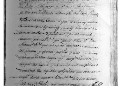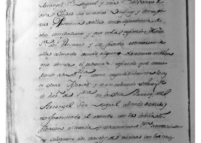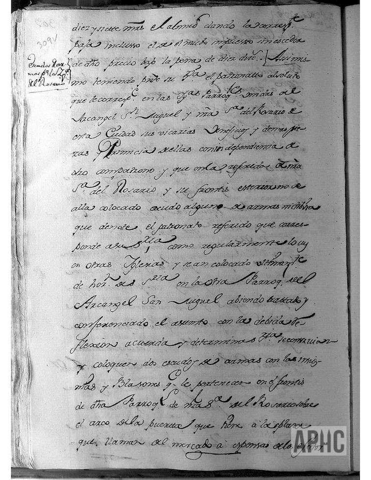 Entre otros asuntos, teniendo presente que en el frontis de la parroquia de Ntra. Sra. del Rosario, no se ha colocado escudo alguno de armas sin divisa, que denote el patronato que corresponde a su Señoría (Ayuntamiento), como regularmente hay en otros parroquias y se han colocado últimamente, de orden de su Señoría, en la de parroquia de San Miguel, se acuerda se coloquen 2 escudos de armas con las insignias y blasones que le pertenecen, en el frontis de dicha parroquia de Ntra. Sra. del Rosario, sobre el arco de la puerta que tiene a la plaza que llaman del Mercado, facultando a su Regidor Don Francisco de Sales Virto de Vera, para que pueda tratar y ajustar la construcción de dichos escudos.