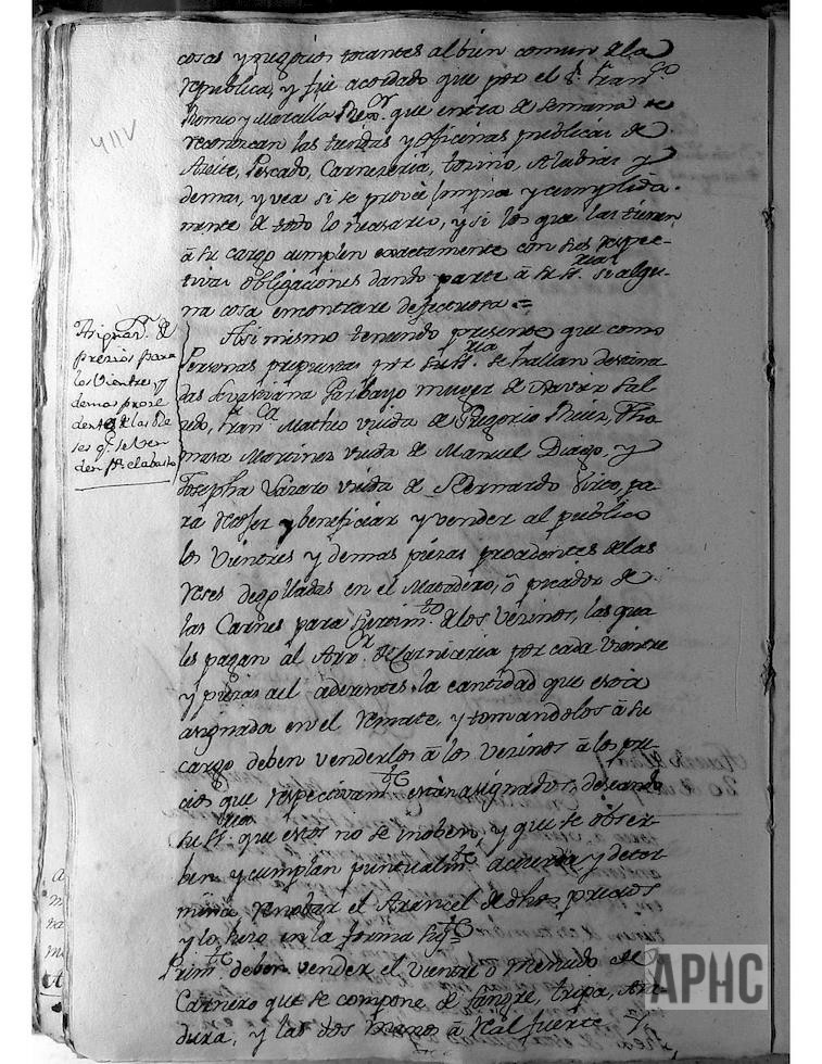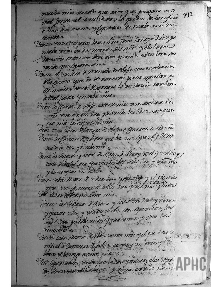 Entre otros asuntos, se hace presente que, como personas propuestas para recoger y vender al público, los vientres y demás piezas de las reses matadas en al matadero, (menuderas, triperas y tripicalleras), están nombradas Sebastiana Garbayo, mujer de X. Salcedo, Francisca Mateo, viuda de Gregorio Ximénez, Thomasa Martínez, viuda de Manuel Diago y Josepha Lázaro, viuda de Bernardo Virto, y que deben vender en la forma siguiente: el vientre o menudo de carnero, que se compone de sangre, tripa, asadura y las dos manos a real fuerte y 9 maravedíes, de modo que aunque pagan al arrendador 1 real fuerte, les queda de beneficio los 9 maravedíes restantes. También, 1 asadura a 12 maravedíes; una sangre a 19 maravedíes; las 2 manos, 6 maravedíes; la tripa, 10 maravedíes, entendiéndose esto cuando cada cosa se vende por separado. El vientre o menudo de oveja, con inclusión de la cabeza que va de aumento para igualar su estimación con el carnero, lo venderán a real fuerte y 9 maravedíes. La cabeza de oveja a 14 maravedíes; una asadura 10 maravedíes; una sangre a 16 maravedíes; las 2 manos, 4 maravedíes; la tripa, 8 maravedíes. Una libra de sangre de oveja o carnero, 6 maravedíes. La cabeza de carnero, que va por separado del menudo, a 19 maravedíes. La lengua y sesos de vaca o buey, real y medio, y vendiéndolos por separado, los sesos 18 maravedíes y la lengua, 1 real. Cada mano de vaca, 16 maravedíes y el pié, 8 maravedíes. La lengua de cebón y sesos, 1 real y 24 maravedíes, y vendiéndolos por separado, los sesos 19 y la lengua 41 maravedíes. Cada mano de cebón, 20 maravedíes y el pié 12 maravedíes. Habiendo hecho comparecer a las referidas Sebastiana Garbayo y demás nombradas, se les hizo presente el arancel de precios, para que los cumplan sin exceder, advirtiéndoles bajo las penas al arbitrio de su Señoría.
