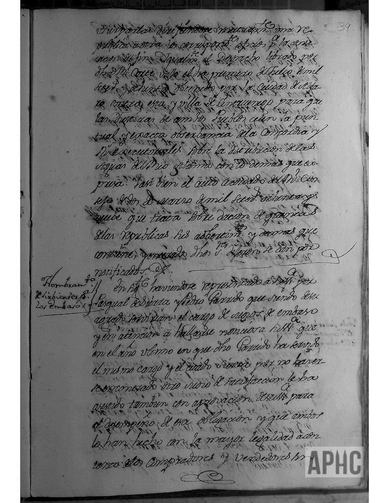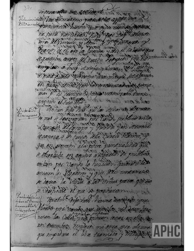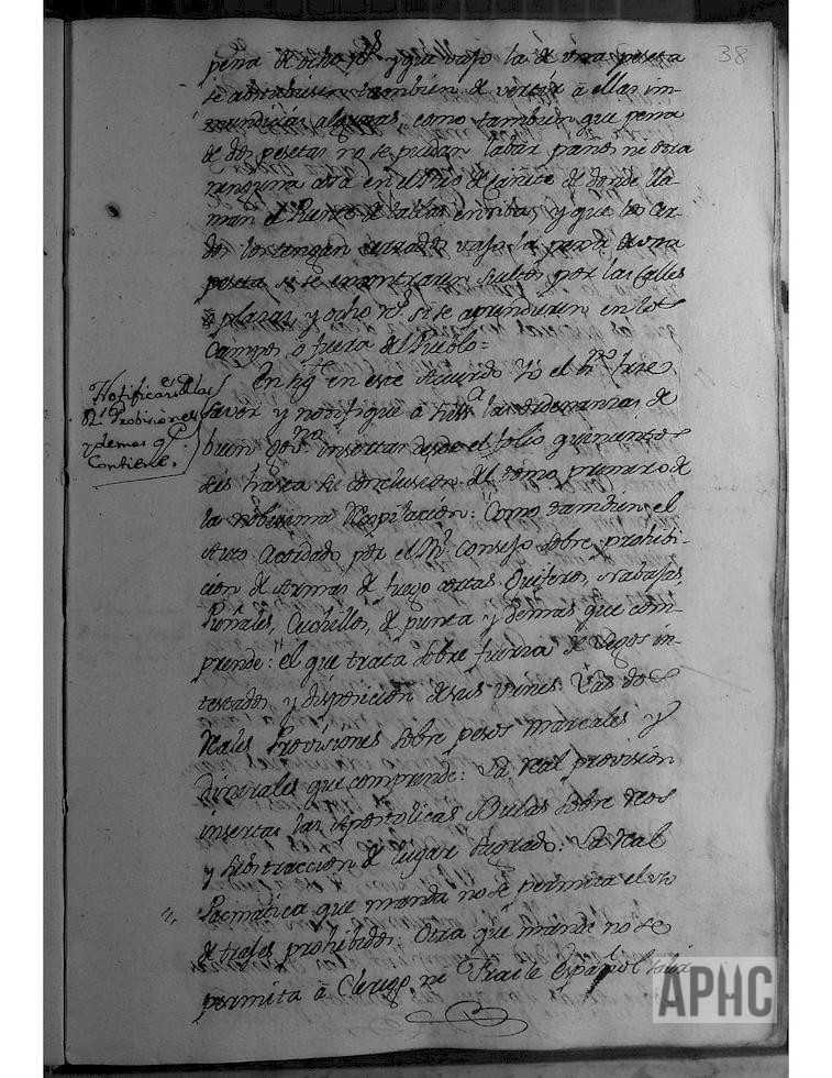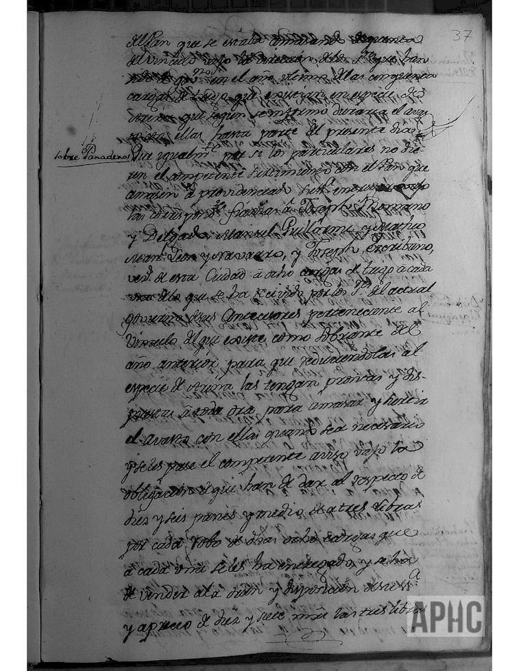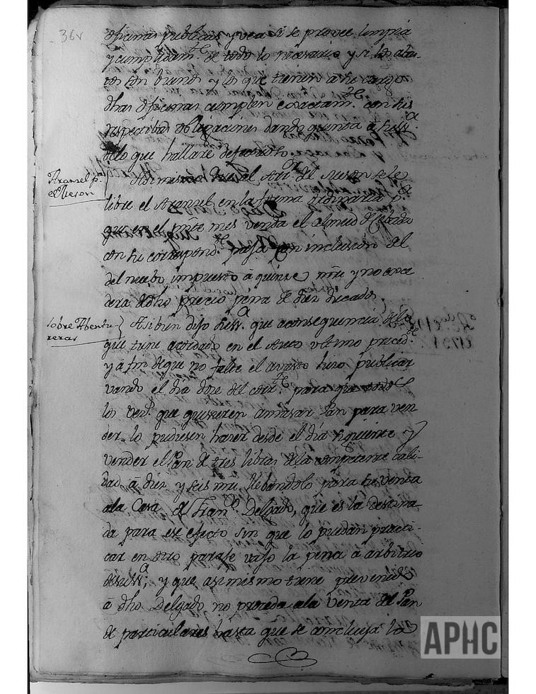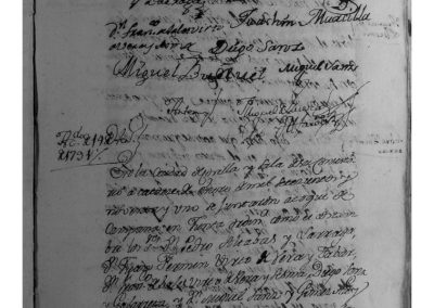 Entre otros asuntos, se acordó que el pan se venda a 16 maravedíes el pan de 3 libras de la competente calidad, llevándolo para su venta a la casa de Francisco Delgado, que es el destinado para este efecto, sin que se pueda realizar en otro paraje, bajo la pena a arbitrio de su Señoría. Se entrega 8 cargas de trigo del Vínculo, bajo las correspondientes fianzas a Joseph Romano y Delgado, Manuel Guillorme y Matheo, Manuel León y Navarro y Joseph Escribano, para que lo tengan dispuesto, por si no hubiese el abastecimiento necesario para los vecinos. Que mediante providencia, esta nombrado Depositario del Vínculo y administrador de los y Granos, en la forma y con el salario que se pagaba antes del nuevo proyecto, Joaquín Ausejo y Luna. En siguiente, en este acuerdo, yo, el escribano, hice saber y notifiqué a su Señoría las Ordenanzas del Buen Gobierno, insertas desde el folio 506 hasta su conclusión, del tomo primero de la Novísima Recopilación; Como también el auto acordado del Real Consejo sobre prohibición de armas de fuego cortas, guíferos, puñales, navajas, cuchillos de punta, y demás que comprende; El que trata sobre fuerza de legos intestados y disposición de sus bienes; Las dos reales Provisiones, sobre pesos mancales y dinerales que comprende; La real Provisión inserta, las Apostólicas Bulas sobre reos y su extracción de lugar sagrado; La Real Pragmática que manda, no se permita el uso de trajes prohibidos; Otra que manda no se permita salir a clérigo ni fraile español de sus dominios, sin llevar pasaporte de su Majestad; La Real Provisión que manda se dé cuenta al Sr. Fiscal Mayor de los delitos graves que contiene; Así bien la carta orden del Excmo. Sr. Conde de Gajes, virrey que fue de este Reino, para que se cele a los desertores; Así mismo, la Real Provisión por patente, para que las Justicias den cuenta de las vacantes de beneficios y otras piezas eclesiásticas; Así bien, la ley que trata sobre compra de uvas y mosto, que es la 42 de las penúltimas Cortes; El despacho del Real Consejo, obtenido por D. Martín Joseph de Goñi y consortes, en 9 de agostó de 1783, que trata sobre la dación de cuentas de Médico, Campo y Cañete; Así mismo, la sentencia pronunciada por la Real Corte de este Reino, en 15 de julio de 1783, en la causa criminal contra Antonio(Atanasio) Navascués, Juan y Manuel, sus hijos, sobre las tropelías ejecutadas con el Licenciado D. Nolasco(Nicolás) Erles, en que se manda, que los del Regimiento de esta Ciudad y los de la villa de Cintruénigo, celen con la mayor exactitud el cumplimiento de las ordenanzas sobre aguas, sin que sus vecinos pasen a usurparlas, dirigiéndose mutuamente una República a otra los correspondientes oficios para la consecución del fin; Igualmente, el despacho librado por dicha Real Corte, bajo el día 1º de Julio de 1780, obtenido por la ciudad de Alfaro, contra ésta y villa de Cintruénigo, para que las Justicias de ambos Pueblos, celen la puntual y exacta observancia de la concordia y reales ejecutoriales, sobre la distribución de las aguas del río Alhama, con lo demás que expresa; Y así bien, el auto acordado por el Real Consejo de 2 de Marzo de 1789, que trata sobre dación de cuentas de las repúblicas, sus advertimientos y demás que contiene, y enterados dichos señores, dijeron se dan por notificados. Por haber desempeñado el cargo a satisfacción de su Señoría, y con la mayor legalidad a contento de compradores y vendedores, sin que hubiese queja alguna, se nombra como criados del embaso a Pascual de Sierra y Pedro Garrido.