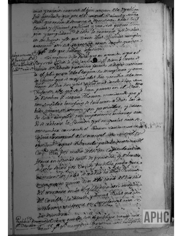Entre otros asuntos, se informa de la carta del Rey (Carlos IV), sobre el feliz parto de la Reina (María Luisa Teresa de Parma) acaecido a las 10 ½ de la mañana del día 16 de Febrero, dando a luz una infanta, a la que en el Bautismo se le han puesto los nombre de María Teresa, mandando se tributen a Dios las debidas gracias, acordando su Señoría, se celebrase la función que, en iguales casos se acostumbra cantando un Te Deum laudamos en la iglesia parroquial del Arcángel San Miguel, celebrándose dicha función el día 6 del corriente mes, habiéndose anunciado por bando y a la que concurrieron los fieles.