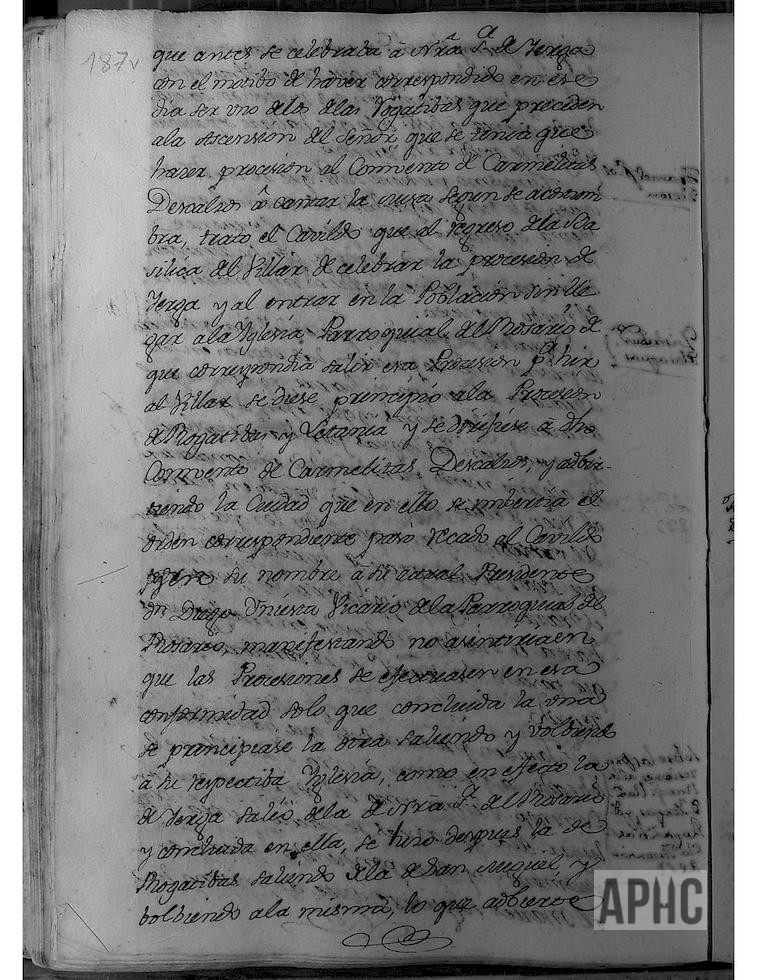 Entre otros asuntos, se trató que, habiéndose celebrado la procesión a Ntra. Sra. del Villar el domingo último, día 5 del corriente, en lugar de la que se hacía a Ntra. Sra. de Mismanos, y correspondiendo hacerse el martes siguiente, día 7, la que antes se celebraba a Ntra. Sra. de Yerga, por coincidir dicho día con una de las rogativas que preceden a la Ascención del Señor, con una procesión al convento de Carmelitas Descalzas (Araceli), a cantar la misa según se acostumbra, se dispuso por el Cabildo Eclesiástico modificar el orden de ejecución de dichas ceremonias religiosas, y su Señoría pasó el correspondiente recado al Presidente del Cabildo Diego Iniesta, Vicario de la parroquia del Rosario, manifestando que el Regimiento no asentiría en la celebración dispuesta por el Cabildo, salvo que se celebrasen conforme se disponía por su Señoría.