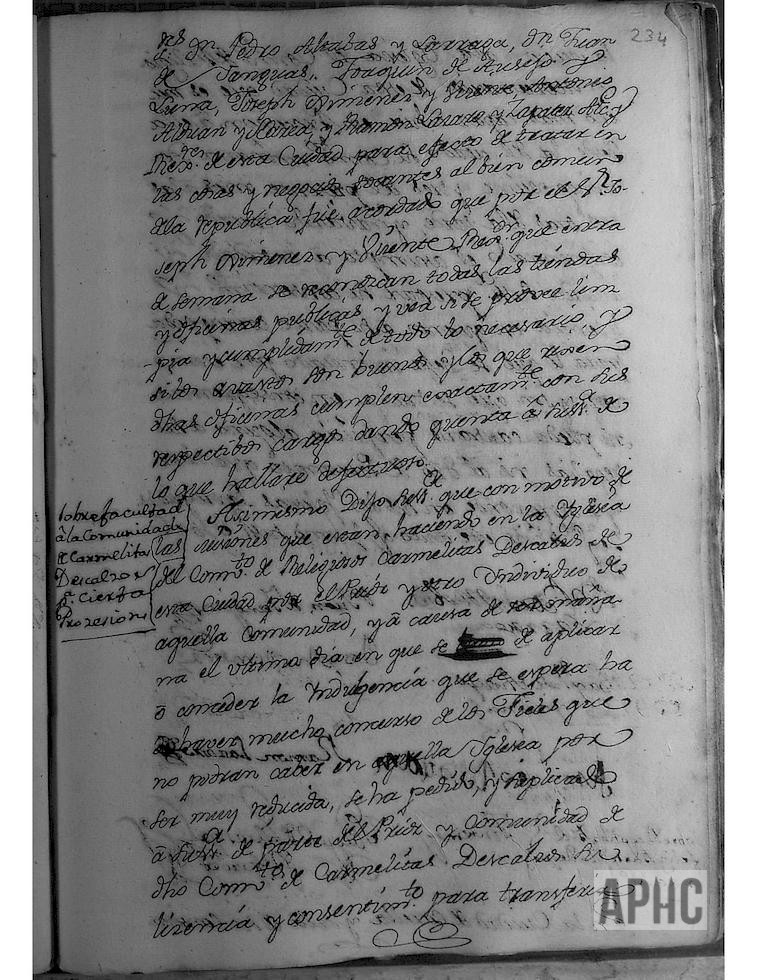 Entre otros asuntos, y con motivo de las Misiones que se están celebrando en la iglesia de los Carmelitas Descalzos de esta Ciudad, se accede a la solicitud del Prior, para que el último día en que se ha de aplicar o conceder la Indulgencia, se espera que ha de haber mucho concurso de fieles, que no podrán caber en su iglesia por ser muy reducida, se concede licencia para transferir la Misión a la iglesia del convento de religiosos Mercedarios (se sigue poniendo “Mercenarios”) de esta Ciudad, que es “mucho más capaz”, e ir en procesión a la misma desde el citado convento, mañana domingo, día 23, a las 3 de la tarde.