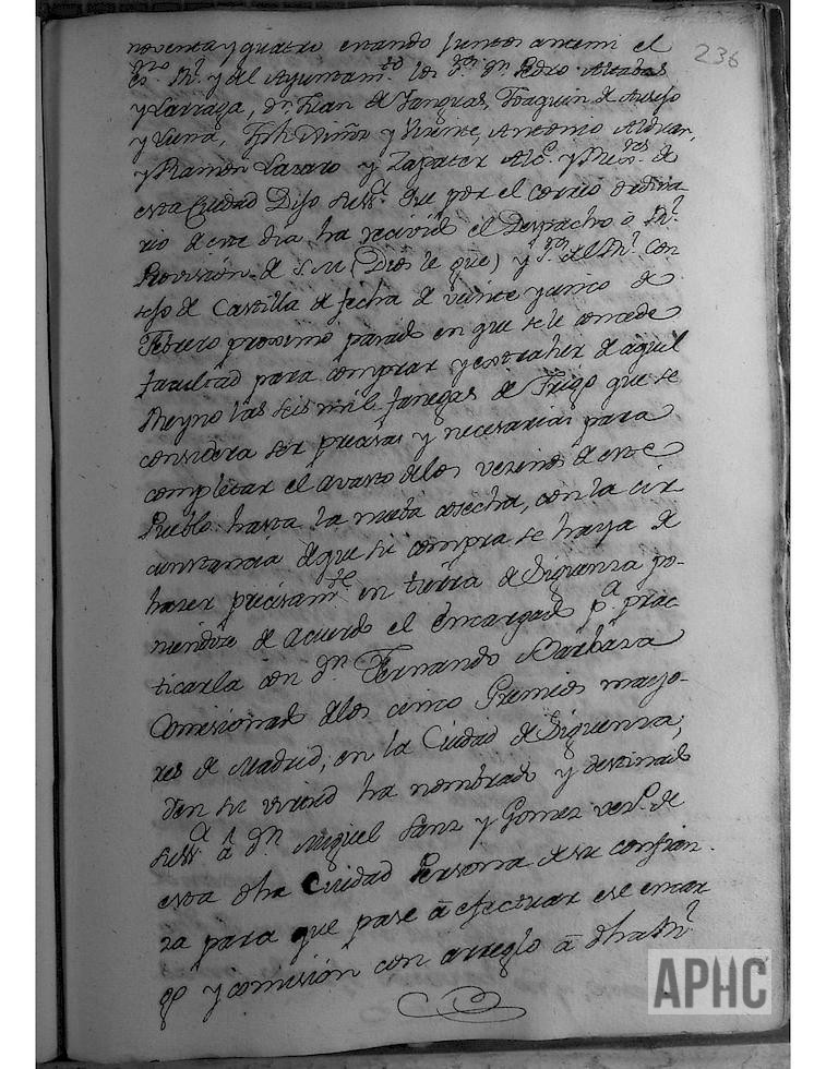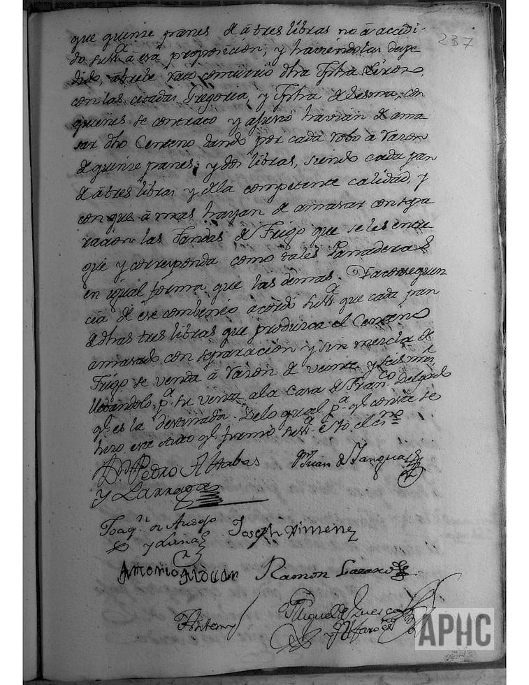 Se informa de que, por correo ordinario, ha llegado el Despacho o Real Provisión de Su Majestad (Dios le guarde) y Sres. del Real Consejo de Castilla, de fecha 25 de febrero próximo pasado, por el que se concede facultad para comprar y extraer de aquel Reino, las 6.000 fanegas de trigo que se consideran necesarias y precisas para el abasto de los vecinos de este Pueblo, hasta la nueva cosecha, con la circunstancia de que su compra se realice, precisamente, en tierra de Sigüenza, poniéndose en contacto con Fernando Barbaza, Comisionado de los cinco Gremios mayores de Madrid, en la ciudad de Sigüenza. Se encomienda dicha gestión de compra a Miguel Sanz y Gómez, vecino de esta Ciudad y persona de confianza. También, en previsión de que se administre el trigo existente en el Vínculo y se pueda abastecer de pan a los vecinos, hasta haber realizado la compra de trigo, se acordó amasar el centeno existente en el Vínculo y se hizo comparecer a las panaderas obligadas María Ximénez y Floristán, Antonia Alduán, María Ximénez y Ximénez, Isabel Igea, Isabel Catalán, Rosa Francés, Rosa Peralta, Manuela Gómez, Eufemia de Sierra, María Magallón, María Martínez, Gregoria de Sesma, Josepha de Sesma y Josepha Liroz, y se les propuso dijesen la cantidad la cantidad de pan que darían por cada robo de centeno y no habiendo ofrecido más que 15 panes de a 3 libras, como su Señoría había realizado varios experimentos, no accedió a dicha proposición y habiéndolas despedido, en breve rato, concurrió Josepha Liroz, con las citadas Gregoria y Josepha de Sesma, con quienes se contrató y ajustó habían de amasar dicho centeno, dando por cada robo a razón de 15 panes y 2 libras, siendo cada pan de a 3 libras y de la competente calidad, además amasarán la cantidad de trigo del Vínculo que les corresponda como a las demás panaderas. El precio de pan de 3 libras que se amase de centeno sin mezcla, se venda a razón de 26 maravedíes, llevándolo para su venta a casa de Francisco Delgado, que es la destinada.