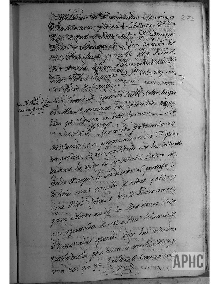 Se hace constar en acuerdo, la carta dirigida por el Cabildo de la real Casa de Ntra. Sra. de Roncesvalles, al Ayuntamiento de Corella, manifestando su deseo de trasladarse junto a la imagen de Ntra. Sra. de Roncesvalles, buscando lugar seguro, debido a la guerra con Francia, y solicita lugar apropiado para exposición y guarda de dicha Imagen. Se les contesta y ofrece un lugar en el altar mayor de la Parroquia de San Miguel, donde se expone tanto la Virgen del Villar como la de Araceli, cuando son trasladadas a dicha Parroquia.