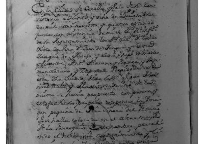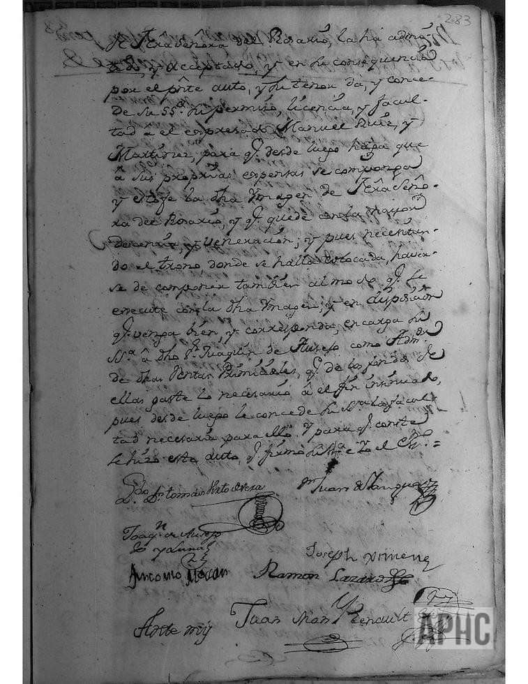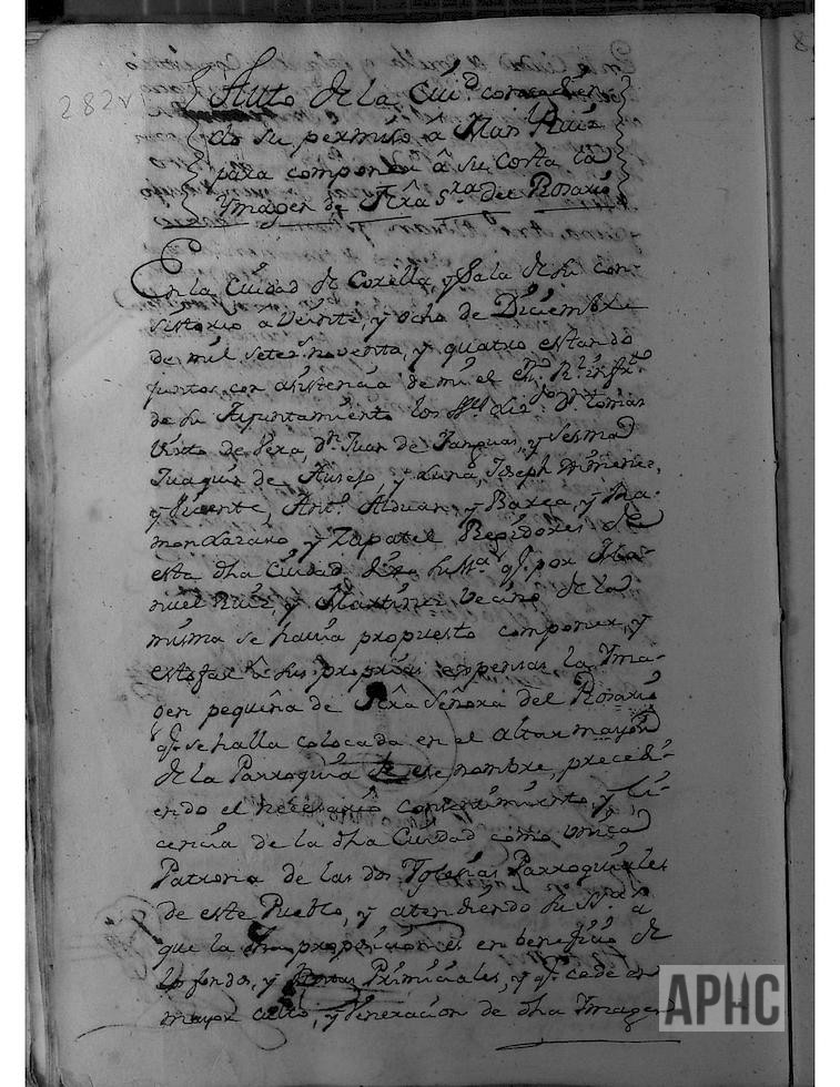 Ante la solicitud de Manuel Ruiz Martínez, para que a sus expensas pueda realizarse la composición y estofado de la imagen pequeña de Ntra. Sra. del Rosario, que está colocada en el altar mayor de ese Parroquia, de la que es única patrona esta Ciudad, se concede licencia y facultad al expresado Manuel Ruiz Martínez, para que a sus propias expensas, se componga y estofe la dicha imagen de Ntra. Sra. del Rosario, y que quede con la mayor decencia y veneración, y pues que necesitando el trono donde se halla colocada, haberse de componer también, al modo en que se ejecute la Imagen, se encarga a Joaquín de Ausejo, como Administrador de las rentas primiciales, para que se realice dicha obra y se gaste lo necesario.