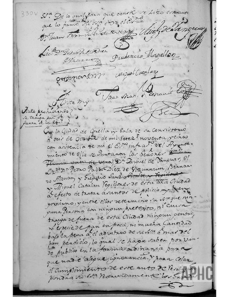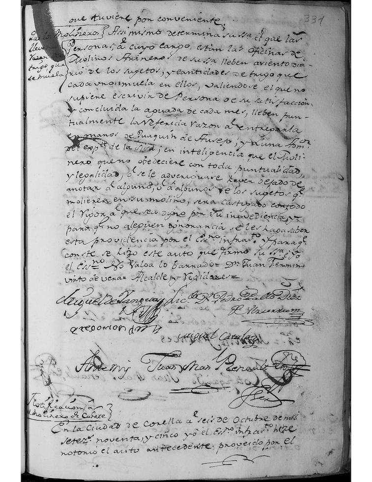 Se acuerda se eche bando público, prohibiendo se traiga de fuera de esta Ciudad, ningún género ni especie de pan, en poco o en mucha cantidad, bajo la pena al arbitrio de su Señoría y el pan perdido. Que por las personas responsables de los Molinos, se anote diariamente las personas y cantidades de trigo que cada uno lleve a moler y que al final de cada aguada, se entregue dicho registro a Joaquín Ausejo y Luna, administrador del expediente de la Sisa (cantidad que había de dejarse en el molino como impuesto). Seguidamente, figuran las notificaciones realizadas a los responsables de los distintos molinos de la Ciudad: Joaquín Francés, del Molino nuevo de Cañete, a Martín Francés, del Molino de Enmedio, a Luis Francés, del Molino Bajo, a Blasa Fernández, viuda de Francisco Francés, del Molino Alto, dándose todos por enterados.