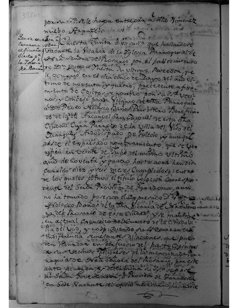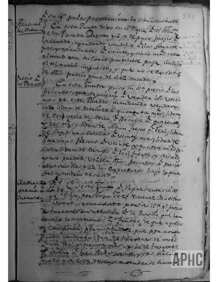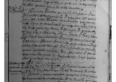 Entre otros asuntos, se puso precio a la libra de pescado que se traiga para vender, como es la libra de merluza a 40 maravedíes; la libra de escabeche de atún o besugo, a 42 maravedíes, la libra de atún fresco a 1 real; la libra de sardinas saladas a 20 maravedíes; la libra de sardinas frescas a 24 maravedíes; y la libra de besugo (fresco) 1 real fuerte y 6 maravedíes, a cuyos precios y no otros, se deberán vender dichos pescados. Previa comparecencia de Juan Josef Jiménez, maestro cerero, se aumentó el precio de turrones, en atención a la subida de los géneros y frutos de que se componen, permitiéndose que, por ahora, se pueda vender la libra de turrones de miel a 1 real y 30 maravedíes, y la libra de turrones de azúcar a 3 reales y 26 maravedíes, hasta que se fijen nuevos precios. Se informa que sigue vacante la vicaría de la Iglesia Parroquial de Ntra. Sra. del Rosario, por fallecimiento de Diego Inesta, ocurrido el día 5 de Mayo de 1794, y que se nombró por tal vicario a Pedro Nolasco Baños, presbítero de la Parroquia de San Miguel de esta Ciudad, cura párroco de la Villa del Viso del Marqués, arzobispado de Toledo, y aunque dicho nombramiento se realizó el 20 de Julio de 1794, hasta ahora no ha tomado posesión de dicha Vicaría, se acuerda se pase oficio al obispado de Tarazona, para que tome posesión o renuncie a su nombramiento de dicha Vicaría Pedro Nolasco Baños, para que se pueda realizar un nuevo nombramiento, teniendo presente el perjuicio y daño pastoral que se está ocasionando.