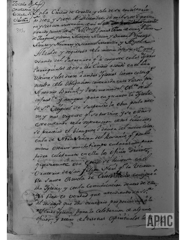 Se hace referencia a que se debía pintar la iglesia de San Miguel, que se ha suspendido, por estar realizándose la reparación de sus cimientos y que el pasado año se ha pintado la iglesia de Ntra. Sra. del Rosario, que estuvo mucho tiempo imposibilitada para celebración de los oficios divinos, que durante esa época, se hicieron en el Oratorio de San Felipe Neri que la venerable Santa Escuela de Cristo, tiene contiguo a dicha Iglesia y con la comunicación dentro de ella, por cuyo motivo su Señoría desea que también se pinte dicho Oratorio, con cargo al Ayuntamiento, mandando recado al Padre Obediencia para que eligiese color, a lo que los hermanos de dicha Santa Escuela, manifestaron que les sería más grato que su Señoría les franquease las tablas necesarias para hacer un zócalo de madera, por cuanto Manuel Gil Ibarra, uno de los hermanos y maestro carpintero, se ofrecía a poner de limosna su trabajo, y los demás hermanos pagarían los clavos. Como su Señoría había comprado una gran cantidad de tablas, con el fin de entarimar las Iglesias, y entre las mismas había tablas delgadas que no servían para fin, y se ofrecieron para que Manuel Gil, tomase de ellas las necesarias, para dicho zócalo.