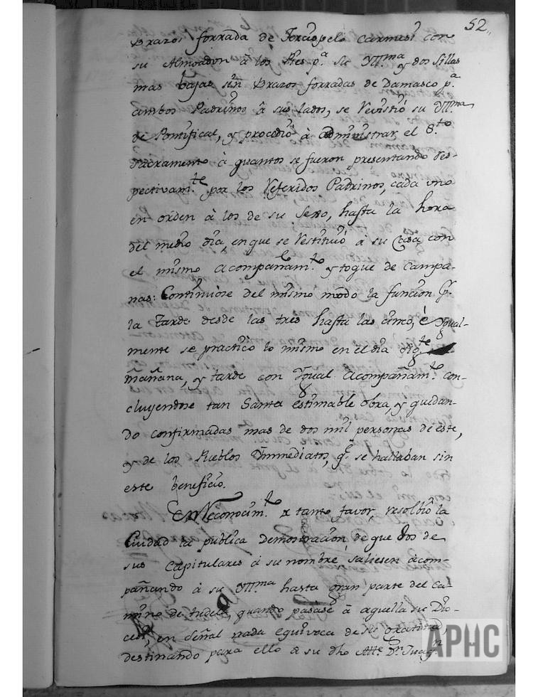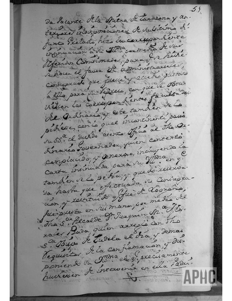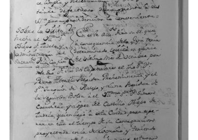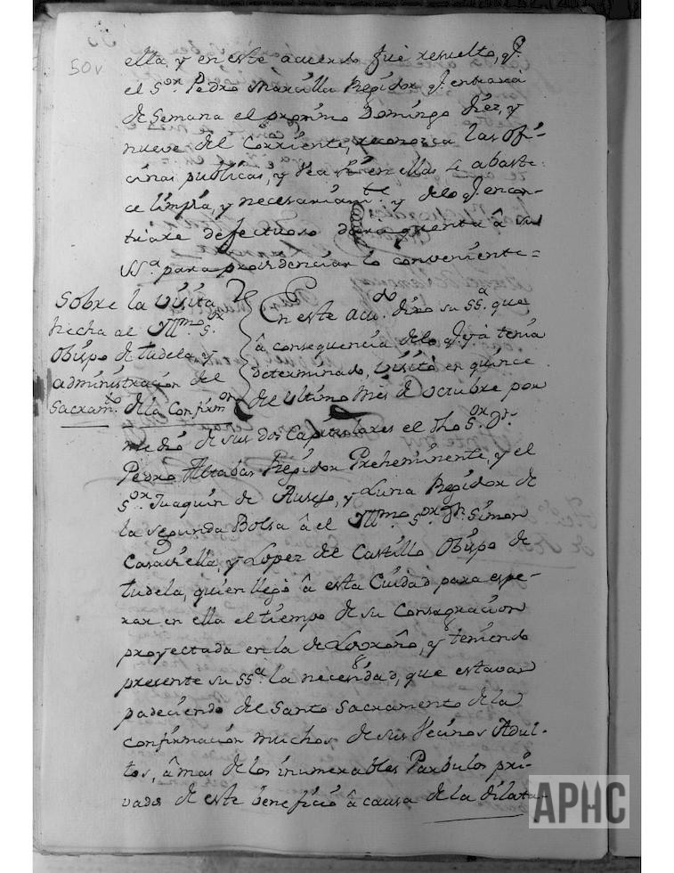 Se informa de que el día 15 de Octubre pasado, visitó esta Ciudad el Ilmo. Sr. D. Simón Casaviella y López de Dicastillo, Obispo de Tudela, y teniendo presente su Señoría la necesidad que había del Sacramento de la Confirmación en muchos de sus vecinos adultos, además de los numerosos párvulos, por cauda de la vacante de la Mitra de Tarazona y anteriores indisposiciones de su último difunto Prelado, se le informó al señor Obispo que accedió para administrar dicho Sacramento a su regreso de Logroño y que se obtuviese la correspondiente facultad del Ordinario. Se designaron por Padrino y Madrina, para dicha ceremonia al Sr. Alcalde y a su hermana María del Pilar Morales Rada, designándose el día 9 del corriente mes, para dicha celebración, que se celebró con toda solemnidad, quedando confirmas más de 2.000 personas de esta Ciudad y de otras poblaciones inmediatas que no había recibido dicho Sacramento. En señal de agradecimiento, el día 12, el Alcalde D. Joaquín Mª Morales y el Regidor Preeminente D. Pedro Altabas, acompañaron en gran parte del camino hasta su Diócesis de Tudela del Sr. Obispo, en un coche tirado por 6 mulas y acompañados del Ministro alcaide, Maceros y Clarinero, a caballo delante y los dos Nuncios a la cabeza del coche, todos ellos uniformados y así salieron de la Población, precediendo al coche de su Ilma. a son de clarín y repique de campanas, y cuando consideraron oportuno, se despidieron con recíprocas demostraciones de atención y respeto, y con la misma formalidad regresaron a la Ciudad.