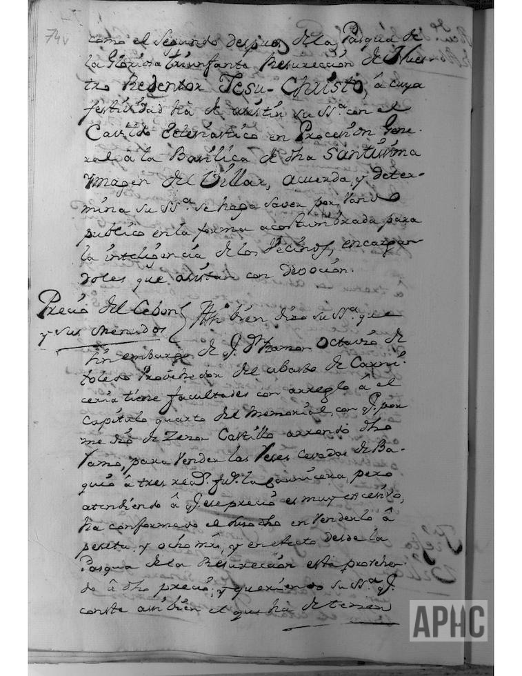 Entre otros asuntos, se acordó se haga saber por bando público que, el próximo domingo se celebrará procesión general a la Basílica de Ntra. Sra. del Villar, para celebrar la función de su festividad, por ser el 2º domingo después de Pascua de Resurrección, a la que asistirá su Señoría y el Cabildo Eclesiástico. Considerando muy excesivo el precio para la venta de reses cebonas, que es de 3 reales fuertes la libra carnicera, se conformó con Zenón Castillo, arrendador de dicho ramo, se venda a 1 peseta y 8 maravedíes. (Aquí se puede ver que la moneda peseta, como posteriormente se conocería, no se corresponde a la mencionada en aquellos años).