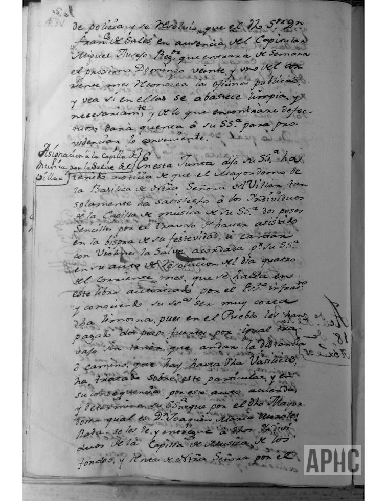 Entre otros asuntos, se acordó que, de los fondos de la Basílica de Ntra. Sra. del Villar, se asigne a la Capilla de Música, por el canto de la Salve con violines, en la víspera de su festividad, la cantidad de 3 pesos, cuando tengan que desplazarse a su Basílica y de 2 pesos cuando por motivo de rogativas, se encuentre su Imagen en alguna de las dos parroquias, donde se realizará el cante de dicha Salve. Al comunicar esta resolución a Joaquín Mª Morales Rada, Mayordomo de la Basílica de Ntra. Sra. del Villar, manifestó que pagó los 2 pesos y nada dijeron los músicos, y que por la misa de la festividad de la Virgen se les abonaba 4 pesos sencillos, como se acostumbra a pagar en las funciones celebradas dentro del Pueblo.
