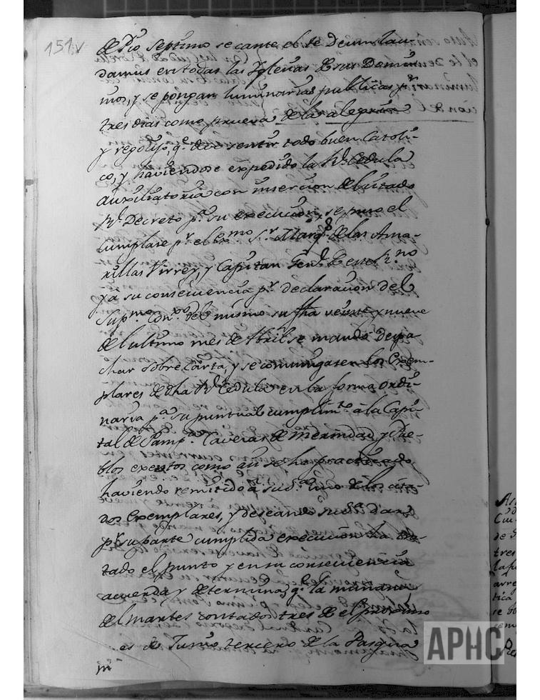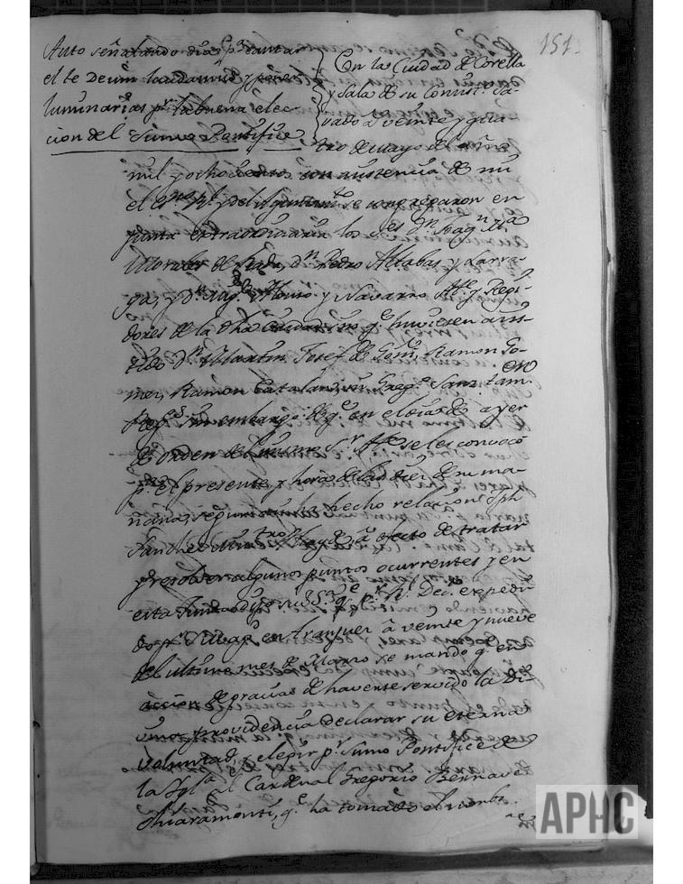 Se informó del Real Decreto expedido por Su Majestad, en Aranjuez, con fecha 29 de Marzo último, por el que se mandó que, “en acción de gracias de haberse servido la Divina providencia declarar su eterna voluntad y elegir por Sumo Pontífice de la Iglesia al cardenal Gregorio Bernave Chiaramonti, que ha tomado el nombre de Pío VII” (realmente se llamaba Luigi Barnaba Chiaramonti), se cante el Te Deum laudamos, en todas las iglesias de sus dominios, y se pongan luminarias públicas por tres días, como prueba de la alegría por dicha elección, y se acuerda que en la mañana del martes día 3 de Junio, se cante, en la iglesia parroquial del Arcángel San Miguel, antes de celebrarse la misa votiva, que como martes tercero después de Pascua de Pentecostés, se canta en semejante día, con el Sacramento expuesto, por voto que tiene hecho su Señoría de muchos años a esta parte, con motivo de la centella que cayó en dicha Iglesia y que no causó lesión a persona alguna. Que las luminarias se pongan en las noches de los días 2, 3 y 4, del próximo mes de Junio y duren desde las 8 a las 9 horas, haciéndolo saber por banco público, para que los vecinos pudientes contribuyan a poner luminarias en los balcones y ventanas principales de sus casas. (Una nota al margen indica: “Asistió la Ciudad en traje de golilla, las tres noches de la función, con arreglo a la práctica y costumbre que se observa en semejantes casos, Renault, escribano”.