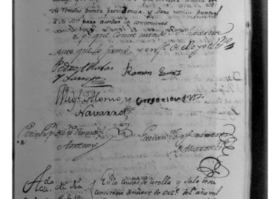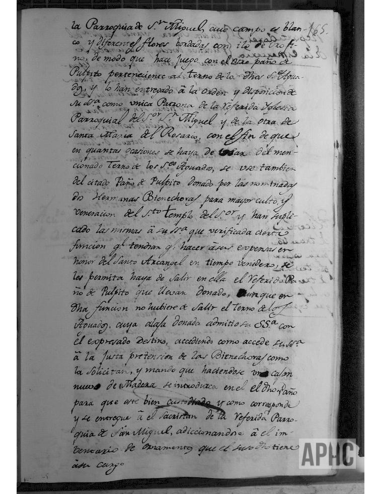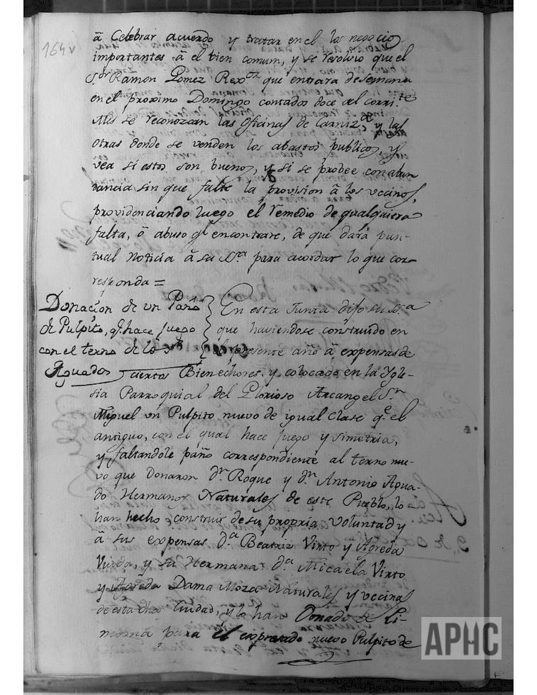 Entre otros asuntos, dijo su Señoría que, habiéndose construido este año, a expensas de ciertos bienhechores y colocado en la iglesia de San Miguel, un púlpito nuevo de igual clase que el antiguo, con el cual hace juego y simetría, y faltándole paño correspondiente al terno nuevo que donaron Roque y Antonio Aguado, hermanos naturales de este Pueblo, lo han hecho construir de su propia voluntad y a sus expensas, Dª Beatriz Virto Ágreda, viuda y su hermana Dª Micaela Virto Ágreda, dama moza, naturales y vecinas de esta Ciudad, y lo han donado de limosna para el expresado nuevo púlpito de la iglesia de San Miguel, cuyo campo es blanco y diferentes flores bordadas con hilo de oro fino, de modo que hace juego con el otro paño de púlpito, perteneciente al terno de los dichos señores Aguado, y dicho paño lo han entregado a su Señoría, como única patrona de la referida iglesia de San Miguel y de la otra de Santa María del Rosario, con el fin de que, en cuantas ocasiones se use el mencionado terno de los señores Aguado, se use también el paño ahora donado, entregándose el mismo al Sacristán de dicha Iglesia y se incluya en el inventario de ornamentos que tiene a su cargo.