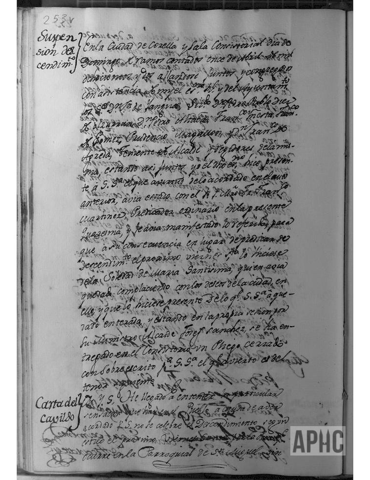 Se manifiesta que por el escribano del Ayuntamiento, se hizo saber al Predicador ordinario de la Cuaresma reverendo padre fray Francisco Martínez, el auto anterior y quedó complacido con los deseos de la Ciudad, y estando en esta sesión, el Ministro Alcaide Josef Sánchez entrega un pliego cerrado para su Señoría del Vicario Francisco Baños Sesma, en nombre del Cabildo Eclesiástico, manifestando que enterado de la suspensión del Descendimiento por las obras de la iglesia de San Miguel, se pensaba realizarlo en la iglesia de Ntra. Sra. del Rosario, sometiéndolo a la aprobación de su Señoría; y su Señoría acuerda no contestar por el momento a dicho oficio.