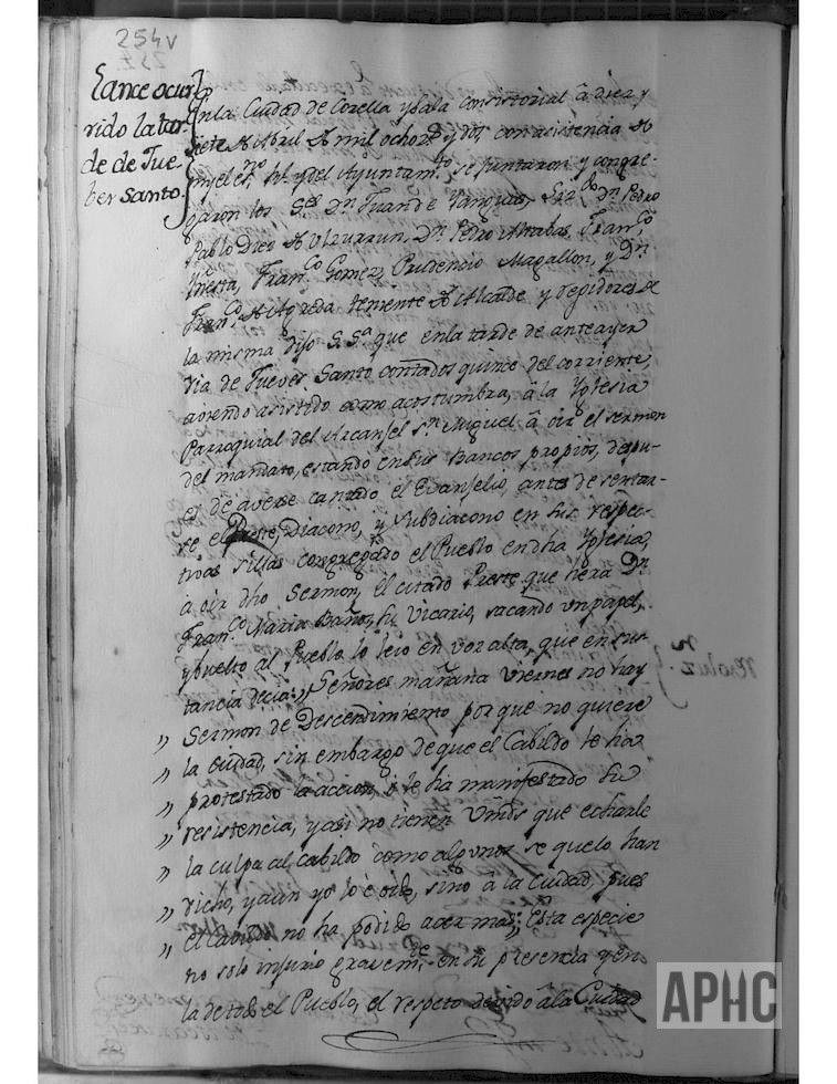 Explica su Señoría que, en la tarde de ayer día 15 Jueves Santo, estando en la iglesia de San Miguel para oír el sermón, estando en los bancos propios de la Ciudad, después de haberse cantado el Evangelio, el Vicario Francisco María Baños, sacó un papel y leyó en voz alta, comunicando a los fieles que, porque no quería la Ciudad, mañana Viernes Santo, no había Sermón del Descendimiento, a pesar de que el Cabildo había protestado la acción y había manifestado su resistencia, y que no había que echarle la culpa al Cabildo, sino a la Ciudad, pues el Cabildo no había podido hacer más. Considera su Señoría que, no sólo injurió gravemente en su presencia y en la de todo el Pueblo, el respeto debido a la Ciudad, sino que que era bastante para concitar a un motín contra su Señoría, en otro Pueblo dócil y obediente a sus órdenes. Se expone que no era el momento, ni se debía presentar como culpable, a los ojos del Pueblo, culpable de la suspensión de dicho Descendimiento, que en la mayor parte de España se ha quitado, quizás por menores motivos que los que tuvo presentes en la resolución, siendo la verdad que el Cabildo o el Vicario, podían haber reclamado en tribunal competente sobre sus facultades, sin poner al Pueblo en disposición de un alborozo, y para vindicar su honor, se acuerda acudir al Alcalde ordinario, entregando original del auto, para que haga uso que tenga por más conveniente.