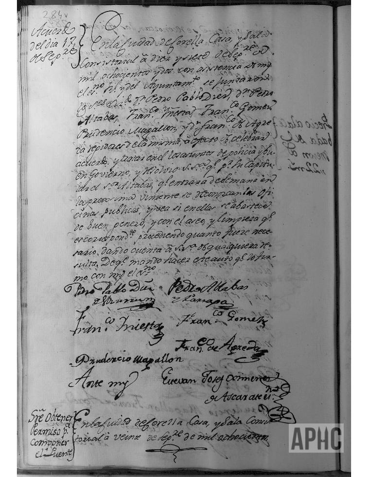 Su Señoría informa sobre el derrumbe, el pasado día 7, de un trozo de puente del río Alhama, que es el único por donde pasa el camino real que dirige a Pamplona, Tudela y otros Pueblos, desde esta Ciudad, y por razón de urgencia lo hizo reconocer por el maestro albañil Miguel de Arigita, que hizo un avance del coste que tendría la reedificación de la pared de cantería y ladrillo que se debería construir, para la subsistencia de dicho Puente, calculándose en la suma de 350 pesos de a cuatro pesetas, remitiéndose por correo, en el día de ayer, al procurador Juan Crispín de Beunza solicite facultad al Supremo Consejo, para gastar dicha cantidad en su reparación. También informa su Señoría sobre las respuestas de los Secretarios de los Ayuntamientos de Pamplona, Estella, Tudela y Tafalla, firmadas por Joaquín López, Manuel Arnedo, Joaquín Alcalde y Rafael de Ororbia, manifestando que tanto por los Regidores semaneros como por los Mudalafes, se realizaba la toma de estima de géneros en sus Ferias, como en el resto del año, sin diferencia alguna, y se acuerda y determina que en esta Ciudad, se actúe al igual que en el resto de Poblaciones consultadas.
