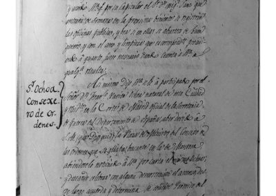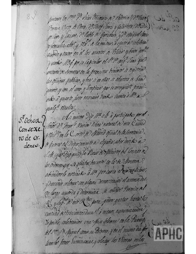 Entre otros asuntos, que por Francisco Javier Ochoa, natural de esta Ciudad y residente en la Corte de Madrid, oficial de la Secretaría de Guerra del Departamento de España, se le ha nombrado Ministro del Consejo de las Órdenes, que se hallaba vacante en la de Montesa, se acuerda celebrar alguna demostración por el ascenso y solicitar permiso al Real y Supremo Consejo, para poder gastar hasta 300 ducados, para celebración de misa solemne en la parroquia de San Miguel, poner luminarias, vítores y que, recogida la cosecha de granos, sin un mal temporal y, gozándose de completa salud, se tenga, para la diversión, una novillada con novillos jóvenes, para que puedan resultar desgracias y abonando alguna cantidad el Santo Hospital, ya que un frontis de la Plaza es suyo propio y, arrendándose las ventas y arcos, se puede lograr alguna utilidad con la que pueda reembolsarse, en parte, los gastos ocurridos el último año, por el crecido número de enfermos que, en varias temporadas ha tenido. También se acordó, se publique, en la forma acostumbrada, bando que dispone la ley, de los jornales de los artesanos y demás, con señalamiento de los mismos y horas de trabajo.