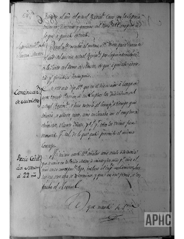 En la Ciudad de Corella, Casa y Sala Consistorial a 2 de enero de 1806, se juntaron los Sres. Licenciado D. Pedro Pablo Díez de Ulzurrun, D. Francisco de Sales Virto de Vera Sesma, D. Pedro Altabas y Larraga, D. Josef Sesma y Vicente, Licenciado D. Miguel de Ágreda y D. Baltasar Arnedo, Alcalde y Regidores de la misma, mayor parte de los de su Regimiento (es también Regidor Ramón Lázaro Zapatel), dijo su Señoría que, desde luego que tomó posesión de sus empleos en el día de ayer, quedó encargado de la semanería el Sr. Virto, por quien da principio y sucesivamente sigan los demás Regidores. Se nombró Presidente de la Junta de Estudios y Escuelas para este año, al Sr. Virto. Se nombró para la dirección del ramo del Garapito, para este año, al Sr. Virto. Se nombró para Superintendente de la Junta de Abastos, también al Sr. Virto. Se hizo constancia de que continuaba con el empleo de Ministro Vicente Inesta, para que, por todos los vecinos, fuese conocido, de lo que quedó prevenido el Concejo.