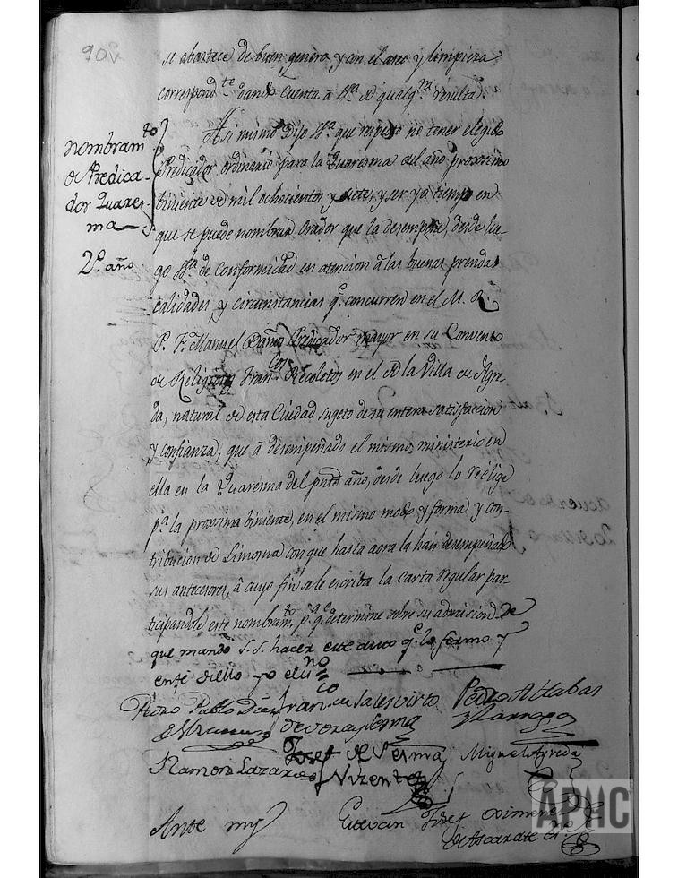 Entre otros asuntos, y por no estar nombrado predicador para la Cuaresma del próximo año de1807, se designó a P. Fray Manuel Baños, natural de esta Ciudad, y predicador mayor en su Convento de Religiosos Franciscanos Recoletos de la villa de Ágreda.
